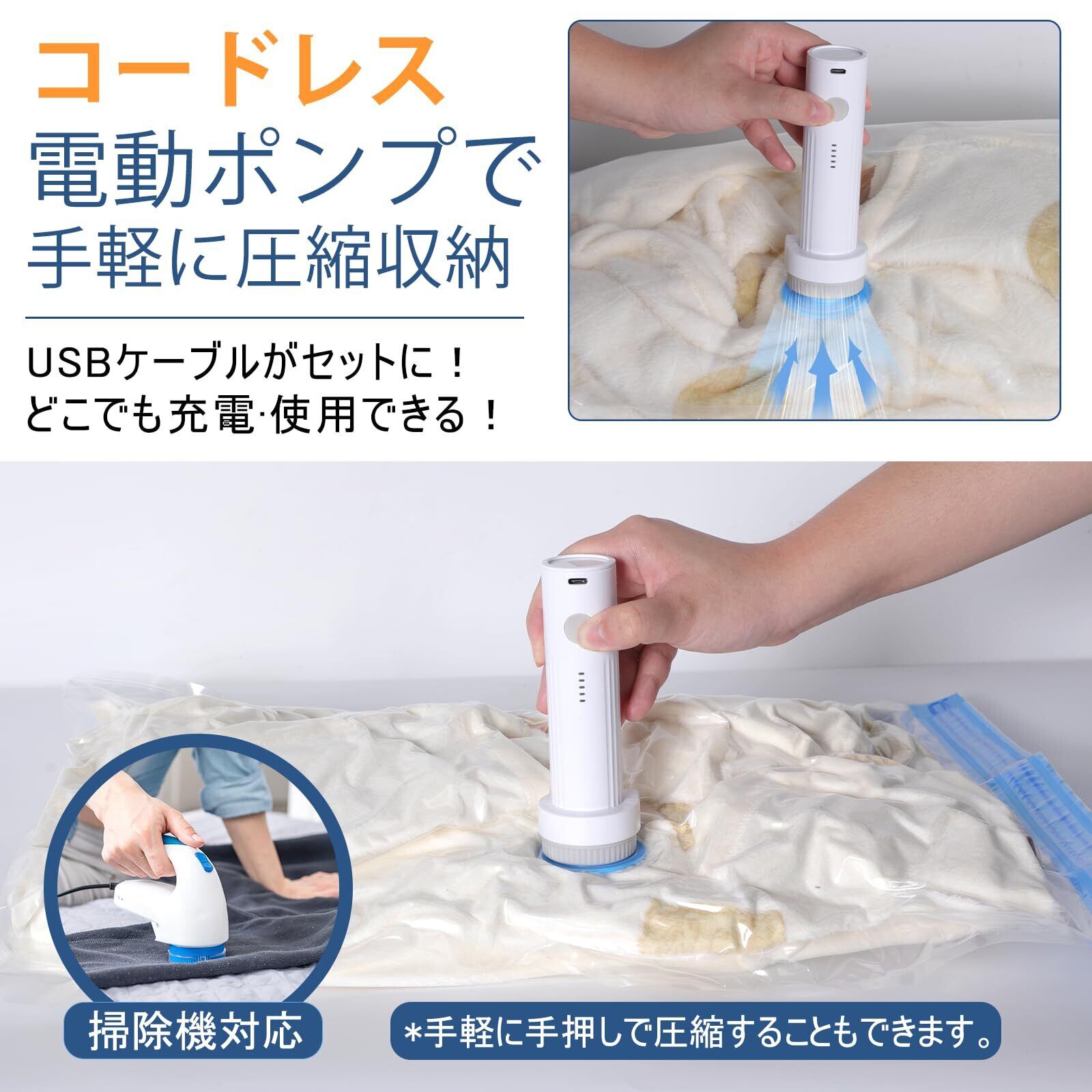 【掃除機いらず・コードレスな電動ポンプ付き】セットには、充電式のコードレス電動ポンプがちゃんと付いているので、コンセントの場所を気にせず、どこでもすぐに使えます。掃除機を出す手間もいらないし、手動ポンプみたいに力もいりません!旅行先や出張先でもサッと圧縮できるので、荷物が多いときにもかなり助かります。USB充電ケーブル付きで充電も簡単。操作もシンプルで、初めての方でも使いやすいよう取扱説明書も付属しています。