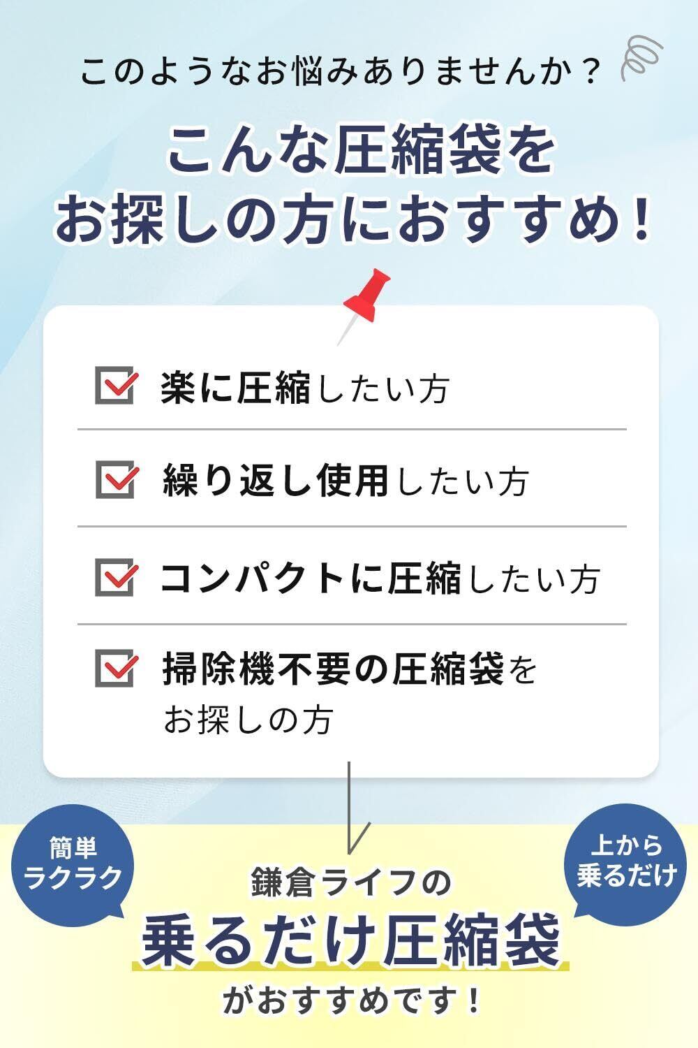 【掃除機不要!乗るだけでラクラク圧縮】 布団や衣類の収納に面倒な作業はもう不要。掃除機なしで、袋の上に乗るだけでしっかり空気を抜いて圧縮完了。誰でも簡単に使える、時短&ストレスフリーな圧縮袋です。