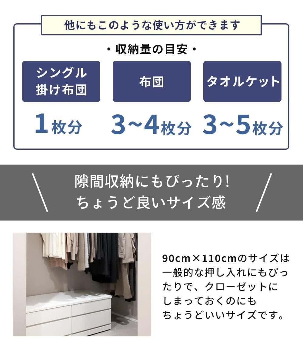 【大きめサイズでかさばる布団もスッキリ】 90×110cmの大判サイズだから、毛布や羽毛布団、ダウンジャケットなどのかさばるアイテムも余裕で収納。クローゼットや押し入れのスペースを有効活用できます。