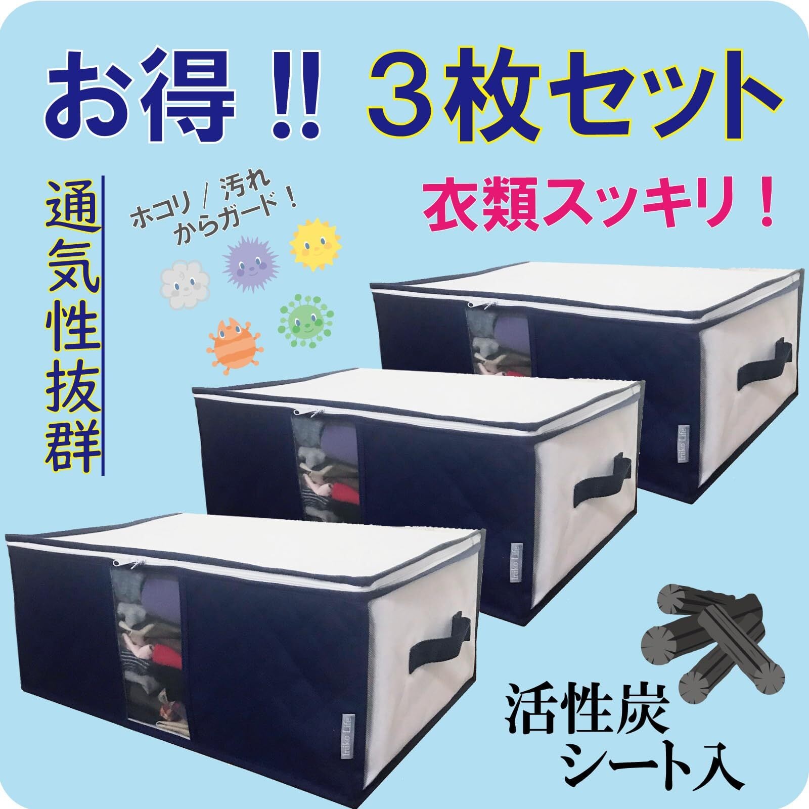 【在庫処分】ふとん 収納袋 特大 2枚組 プラス 衣類収納袋 3枚組 藍色 イニコライフ たっぷり収納 5枚セット 前面 活性炭シート入り 通気性の良い 厚手不織布製 持ち手 透明窓付 まとめてスッキリ収納 便利な収納袋セット 大きく開くファスナー 使わない時は畳める 布団袋 収納ケース 衣装ケース (中芯無し)