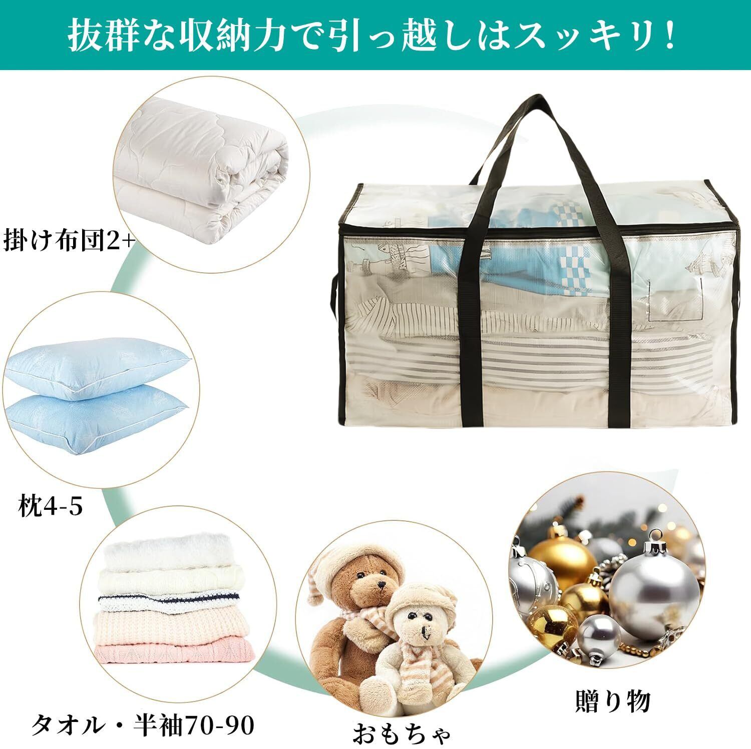 布団収納袋 特大容量 収納ケース 大きいバッグ 防水 防塵 大開口 布団収納カバン 折りたたみ式 引越しバッグ 持ち手付き 大型収納袋 耐荷重 羽毛布団 衣類 日用品 おもちゃ キャンプ用品収納 (透明色, 2枚)