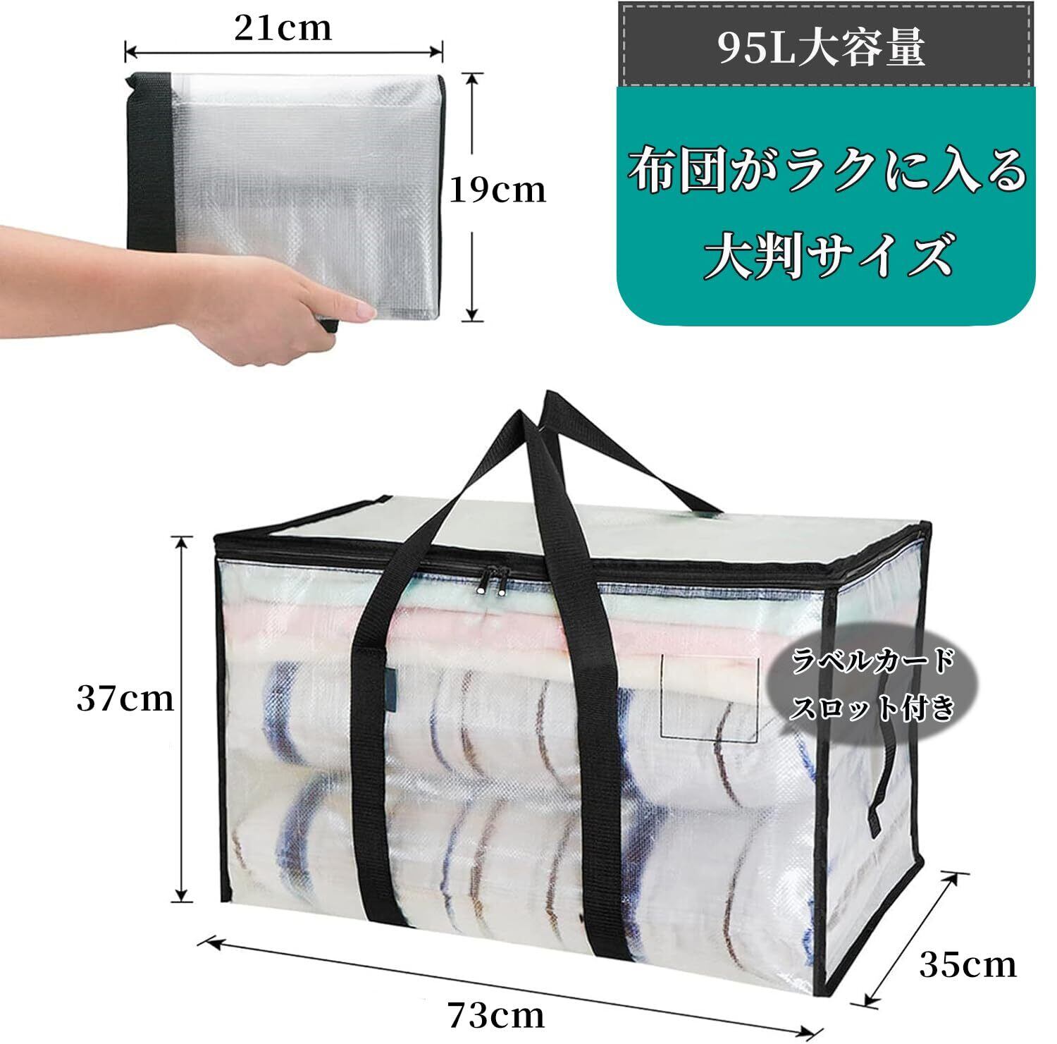 【たっぷり95Lの大容量】:羽毛布団や毛布、コートなどのかさばるアイテムもすっきり収納。73x35x37cm、2枚/4枚セットから選べるので、ご家族の季節ごとの収納ニーズに柔軟に対応できます。それに180°全開きデザインで出し入れラクラク!中身を探す手間もありません。