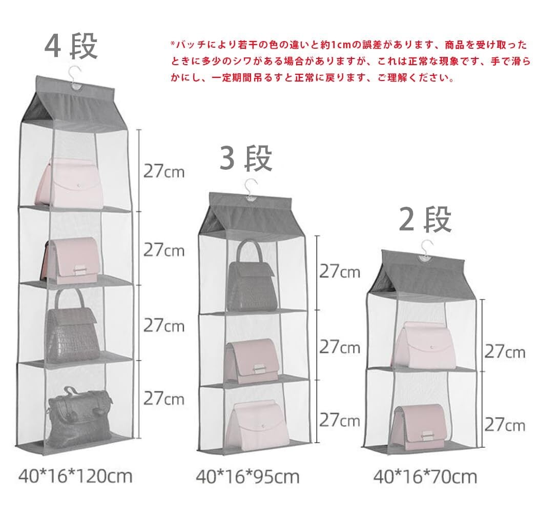 吊り下げ収納 折りたたみ バッグ収納ラック バッグ ハンガー 省スペース 取り付け簡単 防湿 カバン収納 クローゼット 収納 バッグハンガー 4段式 3段式 2段式(4段,グレー)