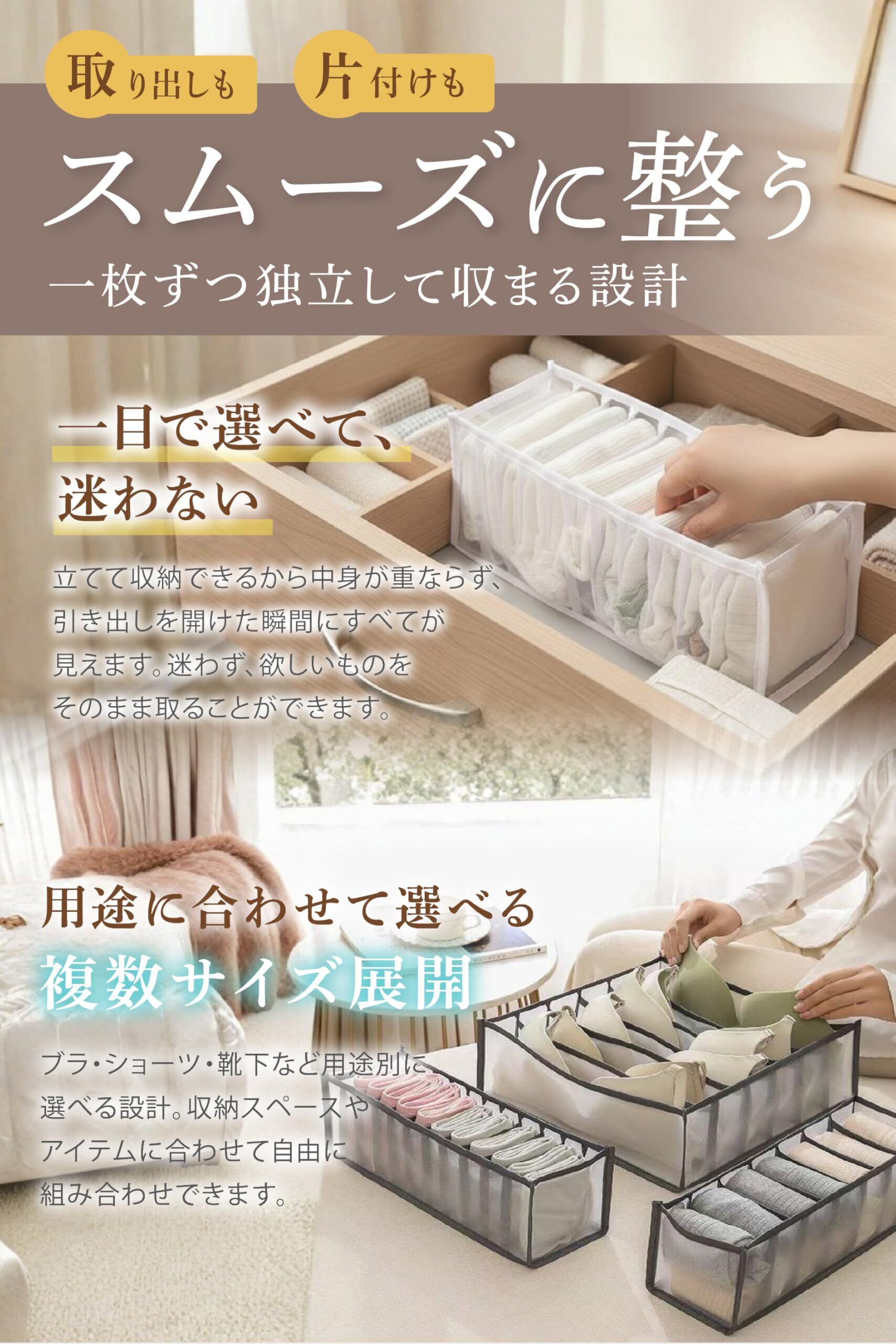 【複数サイズ展開】 ブラ・ショーツ・靴下など用途別に選べる設計。収納スペースやアイテムに合わせて自由に組み合わせできます。