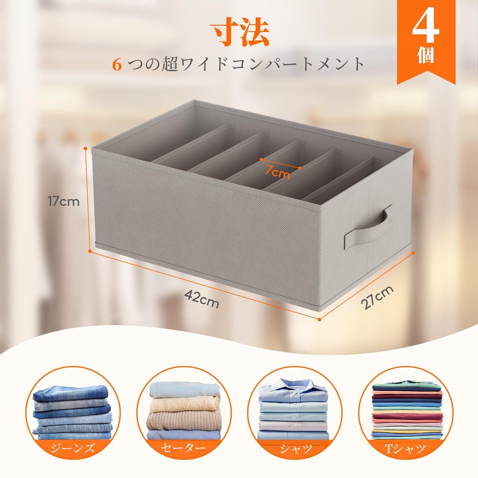 Lifewit ズボン 収納 ワードローブ 衣類オーガナイザー 4個パック 仕切りボックス 大型 幅27 奥行42 高さ17 cm サイズ 6グリッド クローゼット ジーンズ収納ボックス ハンドルとサポートボード付き 折りたたみ式引き出し仕切り セーター、ズボン収納、Tシャツ、パーカー、ドレス用 グレー