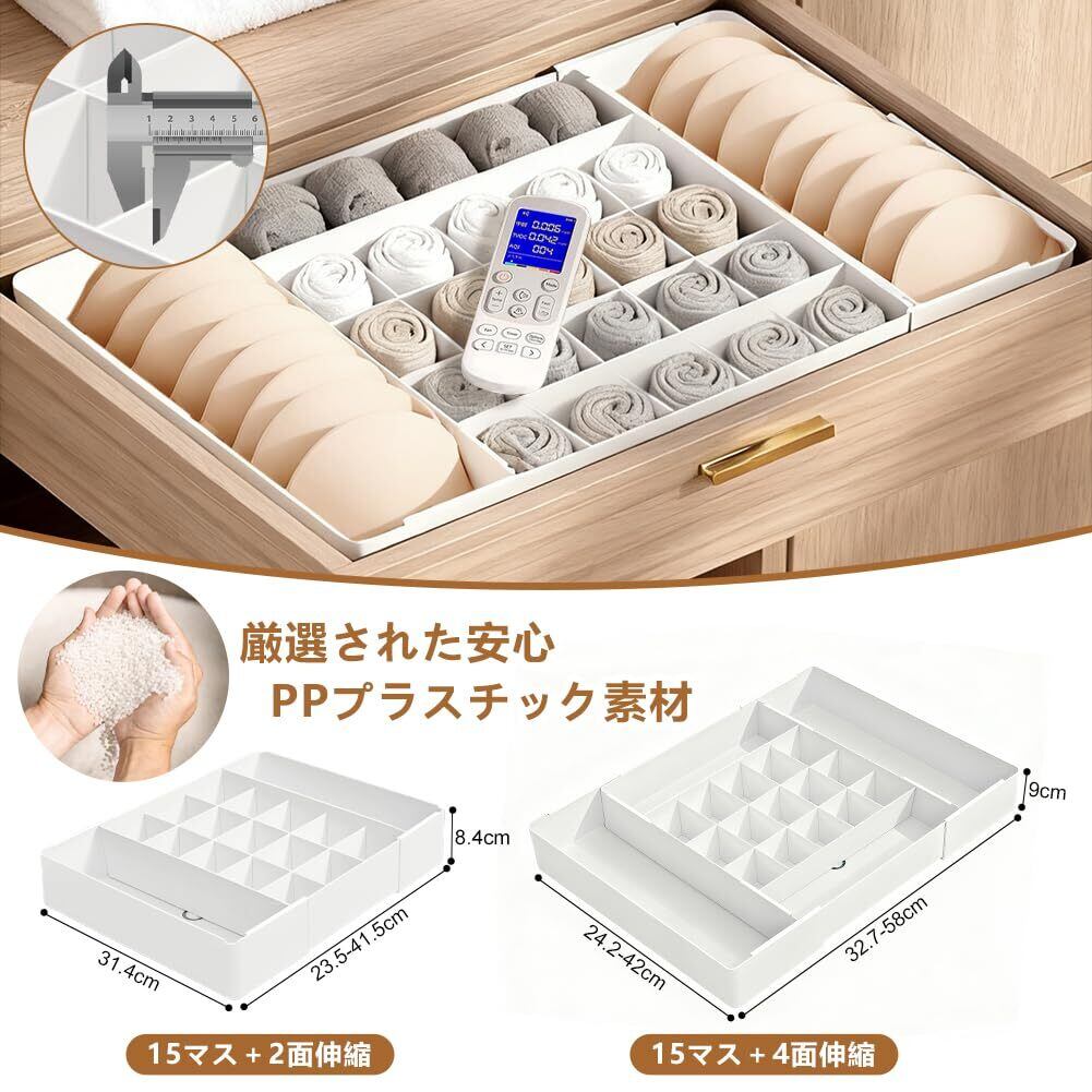 yazi 下着収納ボックス 伸縮収納ケース 引き出し仕切り クローゼット 衣装収納ケース プラスチック 大容量衣類 靴下収納 型崩れ防止 洗える ブラ・下着・靴下・小物収納 ホワイト (15マス+4面伸縮)