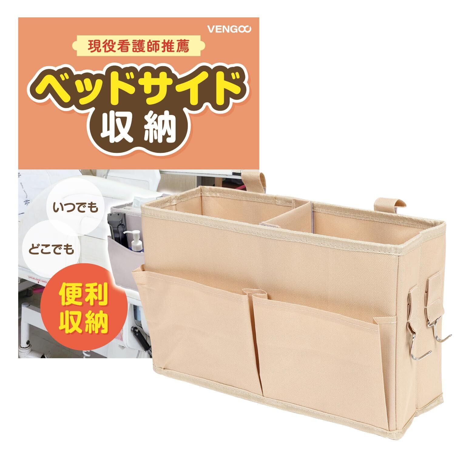 【新着商品】ベッドサイド 収納 ベッドサイドポケット かご【高齢者施設監修】仕切り 片側フック マジックテープ 車 チェア ベビーカー カーキ VENGOO