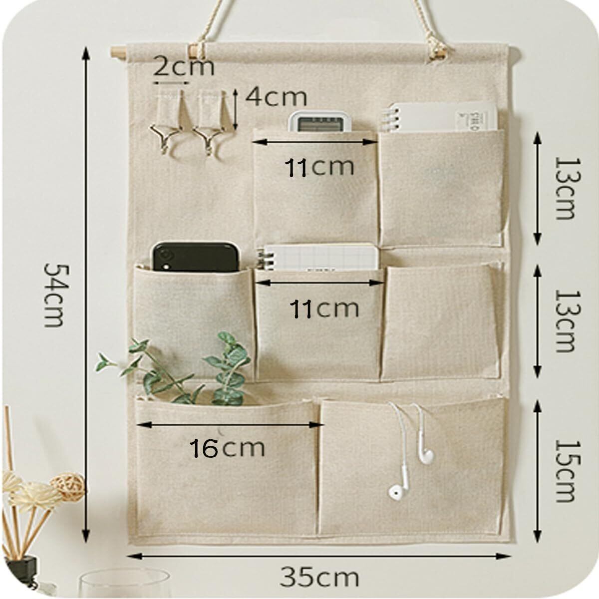【おしゃれなデザイン】天然素材の麻がナチュラルでやさしいウォールポケットです。郵便物や文房具、細々したものの整理整頓に役立ちます。 シンプルなデザインは、お部屋の雰囲気にしっくりなじみます。 大小と2つのサイズのポケットが7個もあるので収納力抜群。上にフックが2つがありますので、鍵、アクセサリなどの小物が収納ができます あまり重いものや刃物など危険なものは入れないでくださいね。