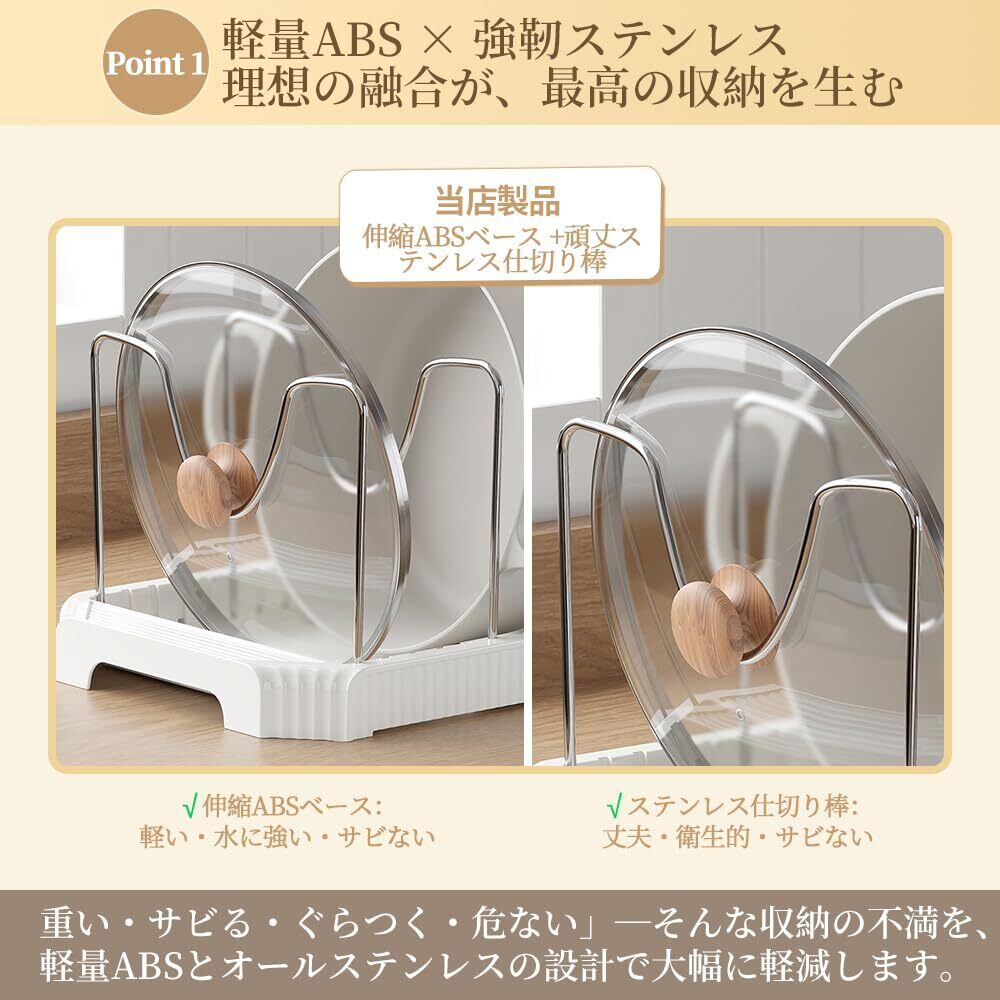 【安定性抜群!鍋蓋・フライパンをしっかり固定】 しっかりとした構造と滑り止め設計により、重い鍋蓋やフライパンを立てかけてもぐらつきや倒れる心配がありません。調理器具の出し入れがスムーズで安全。食材に異物が混入するリスクも軽減し、清潔なキッチンを保ちます。