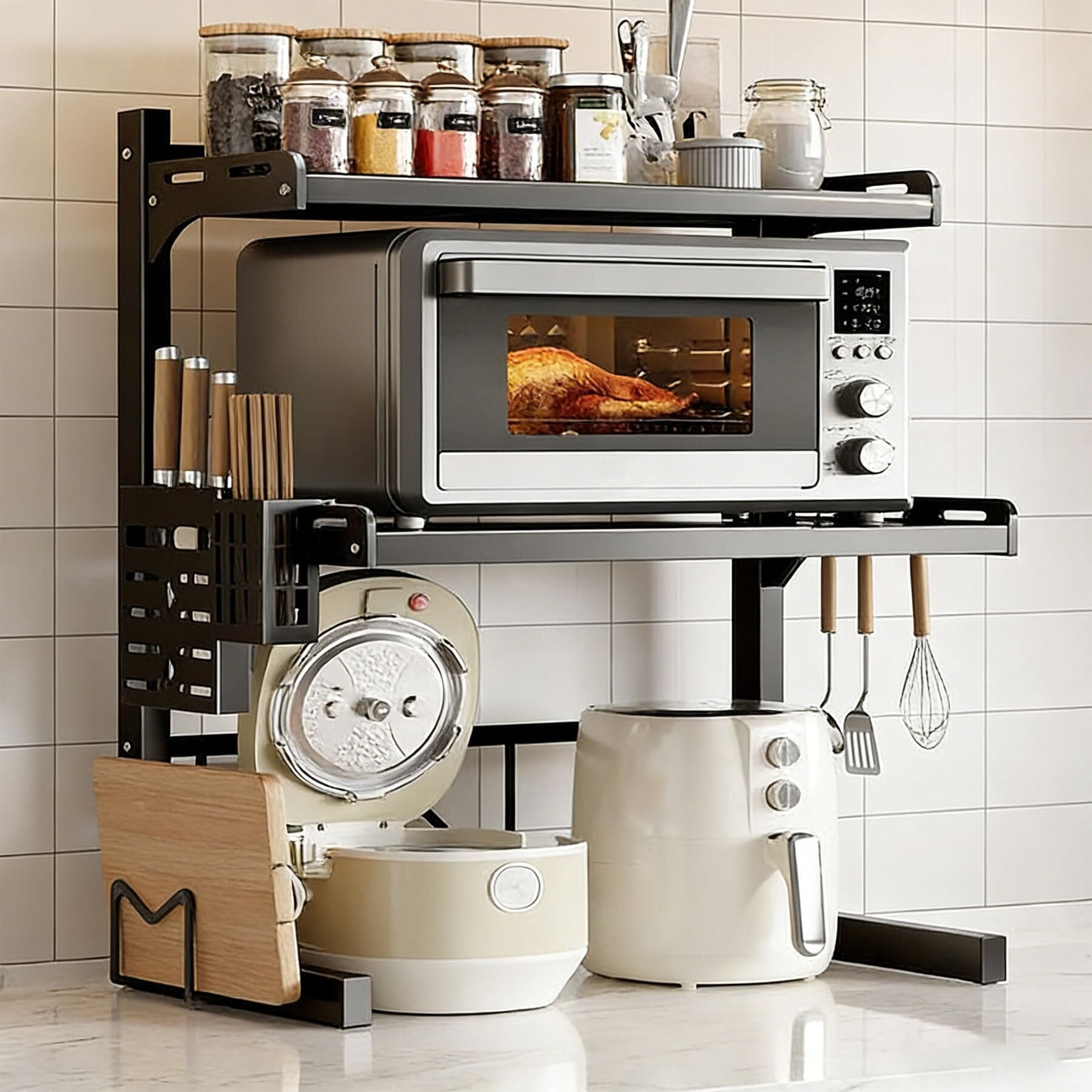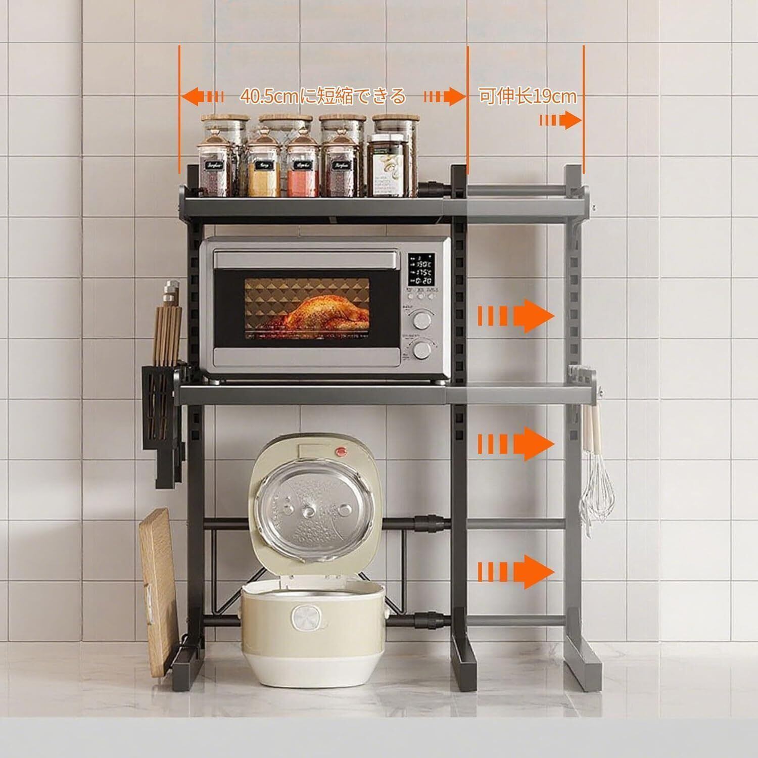 【在庫セール】レンジラック キッチンラック 3段式 幅は41~60cm伸縮可能 キッチン 収納 コーヒーメーカー 電子レンジ ラック 大容量 洗浄しやすい レンジ上ラック 棚板高さ調節可 トースターレンジ台 (長さ40.5~59.5*幅33*高さ76cm) (黒, 3段 アタッチメント付き)