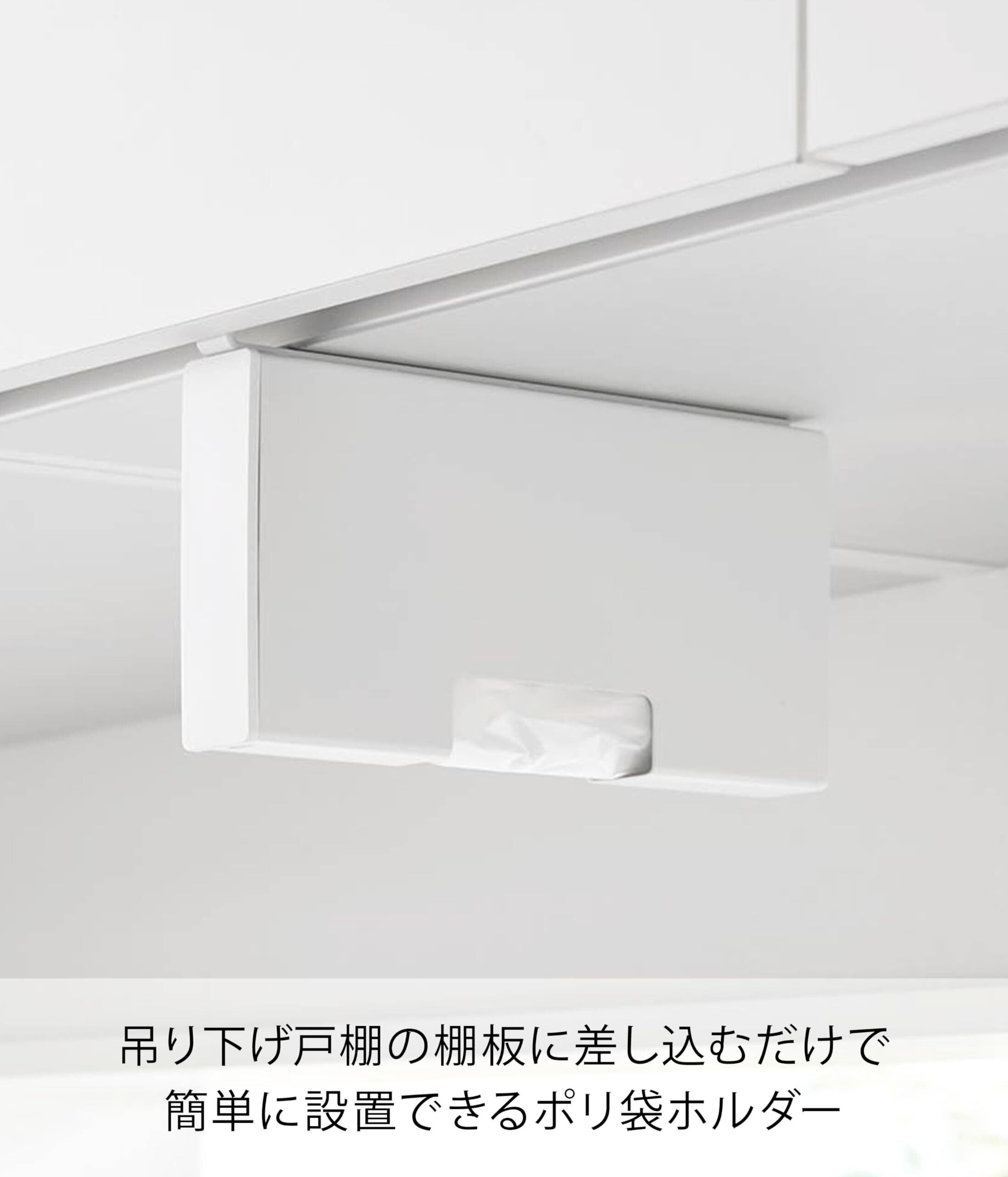 下からサッと取り出せるポリ袋収納ホルダーSサイズです。吊り下げ戸棚に差し込むだけで簡単に設置でき、蓋を開けて入れるだけで補充もスムーズ。付属の仕切り板に巻きつけることで、ポリ袋をスムーズ取り出せます。