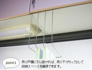 吊り戸棚に引っ掛ければ、吊り下げラックとして収納スペースを確保できます。※扉が浮かずに閉まるには、棚板と扉の間に3.5mm以上の隙間が必要です。