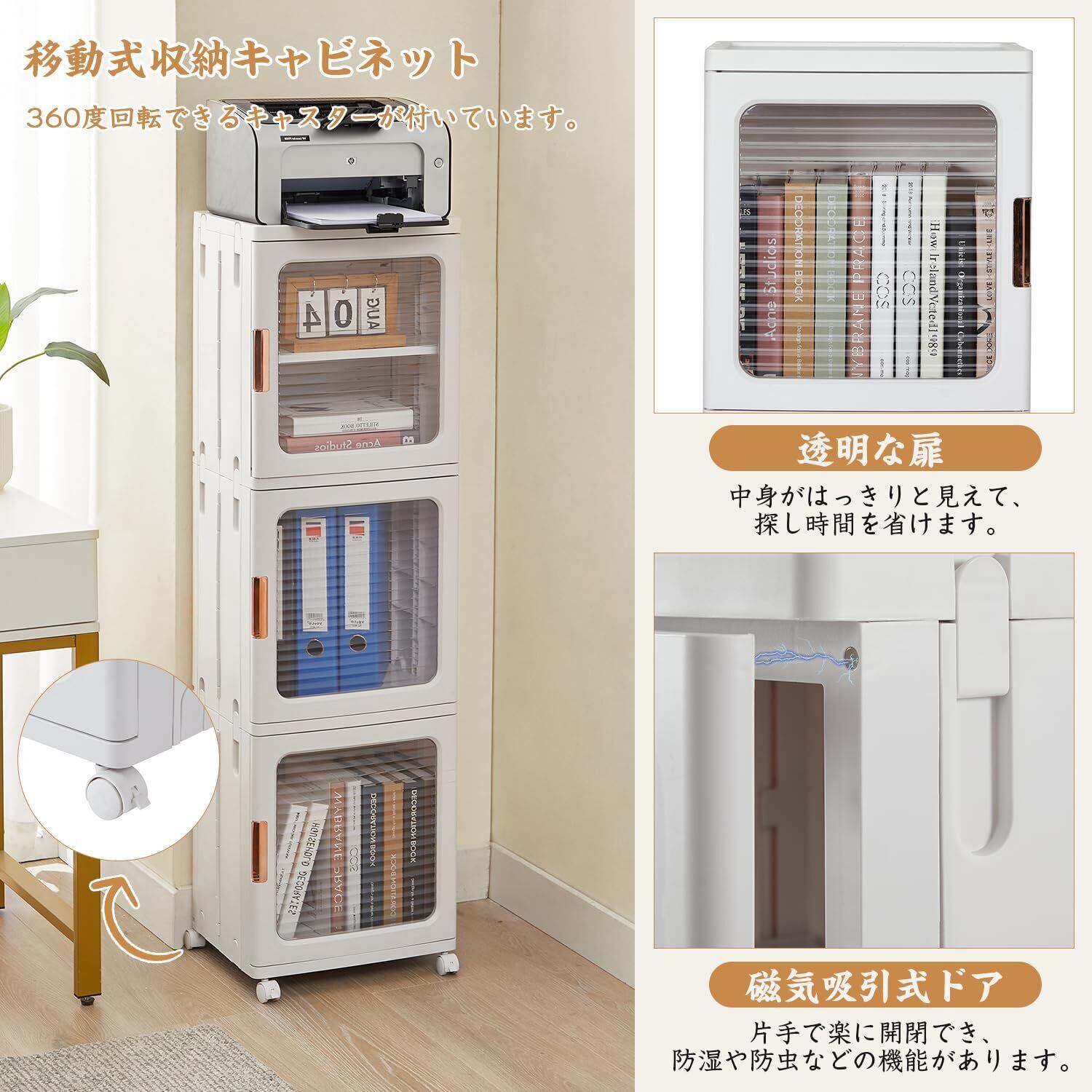 【仕切り板付き・磁気吸引開閉】この収納キャビネットは各段のボックスに仕切り板が付いており、その高さが三階調節でき、様々な収納の需要を満たすことができます。そして、この収納ボックスの扉はすべて磁気開閉なので、物の取り出しがやすく、防塵や防水などの機能も発揮できます。
