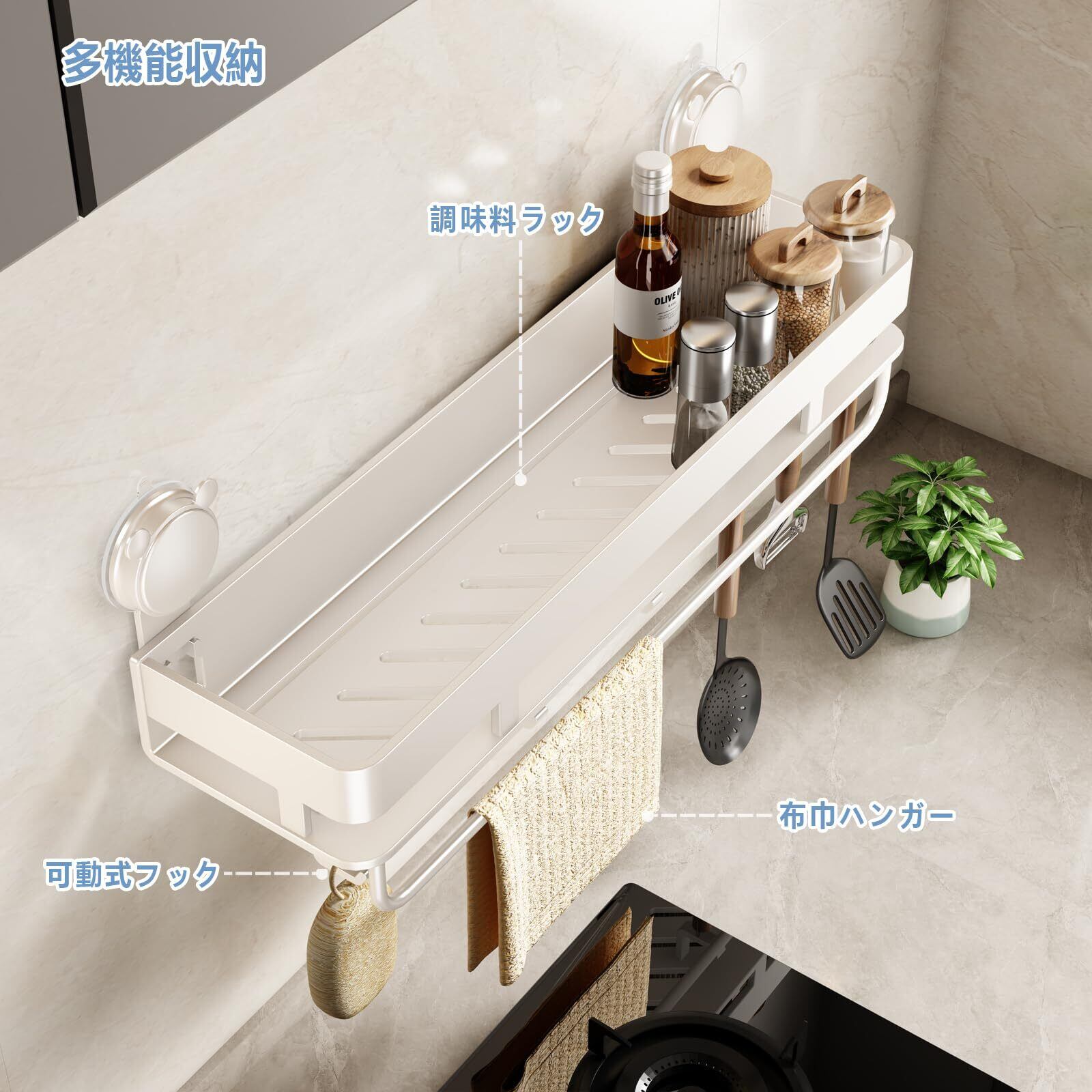 【新春セール】調味料ラック アルミニウム 調味料入れ 吸盤 キッチン 収納 グレイ スパイスラック 防水防錆 調味料ストッカー 壁掛け 調味料 置き 6個移動式フック アイボリーホワイト 40cm CICUFY