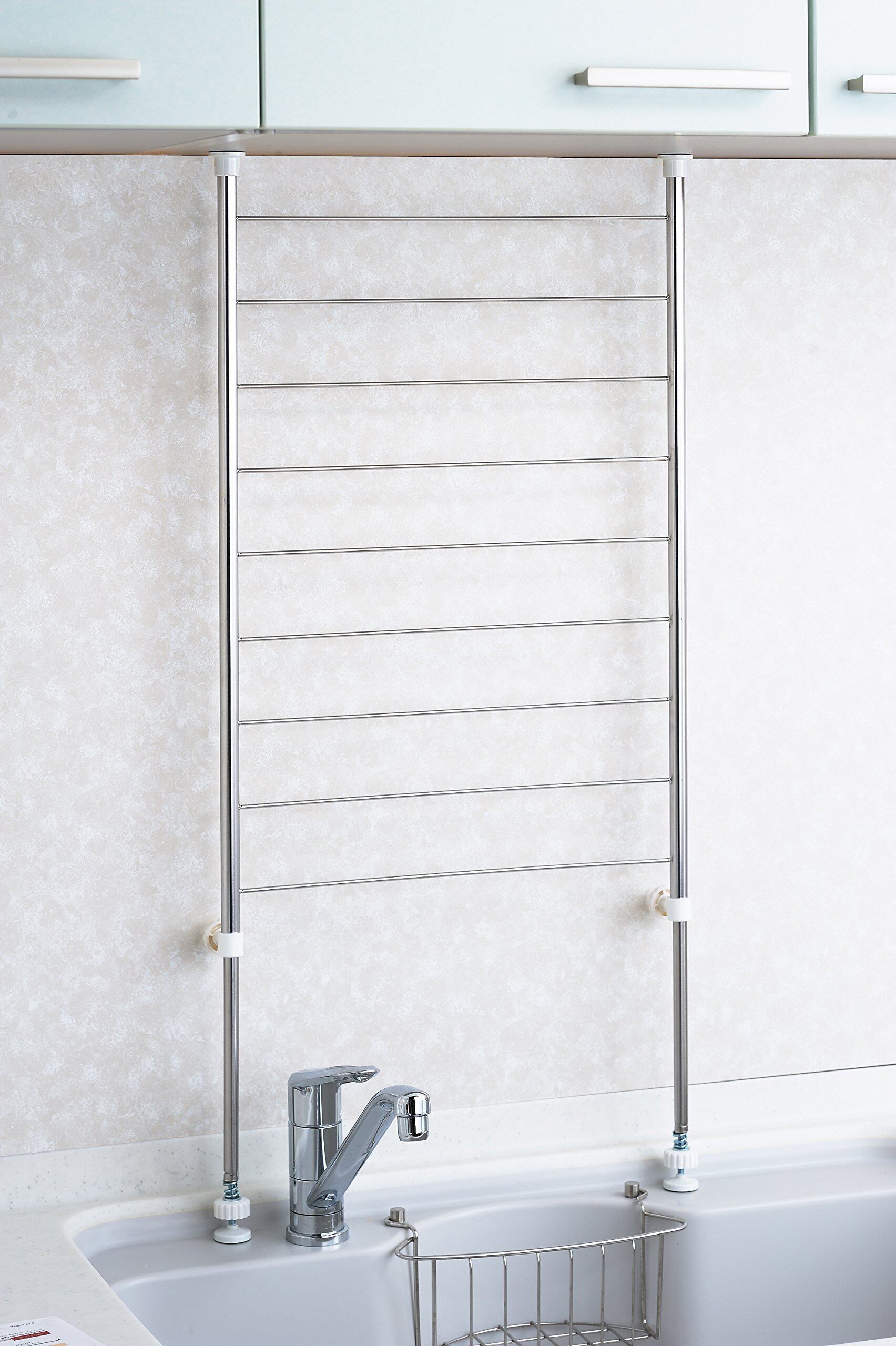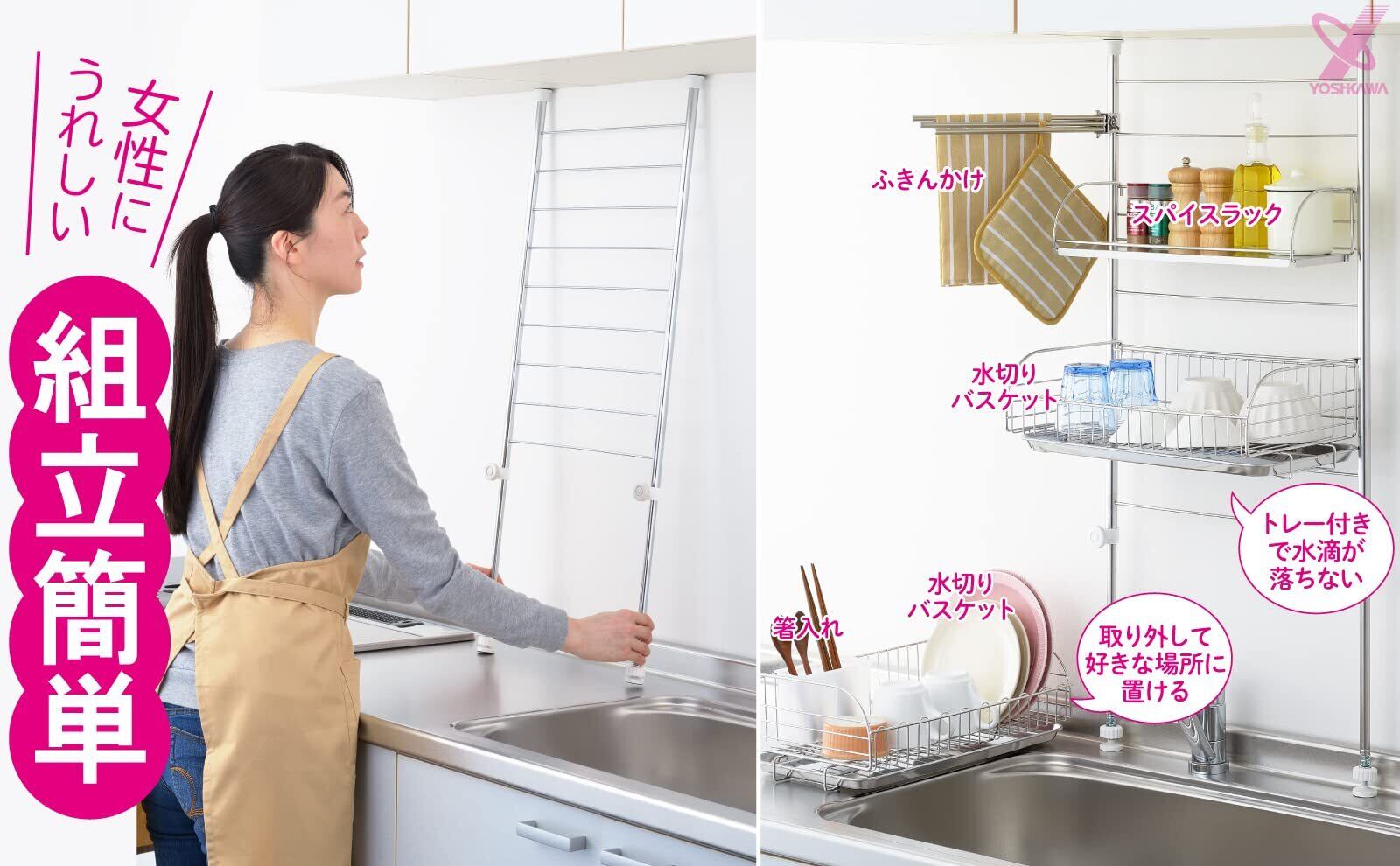 ヨシカワ 水切りラック 突っ張り ステンレス 伸縮 大容量 幅48cm×高さ107cm 省スペース スリム シンク上 日本製 1305037