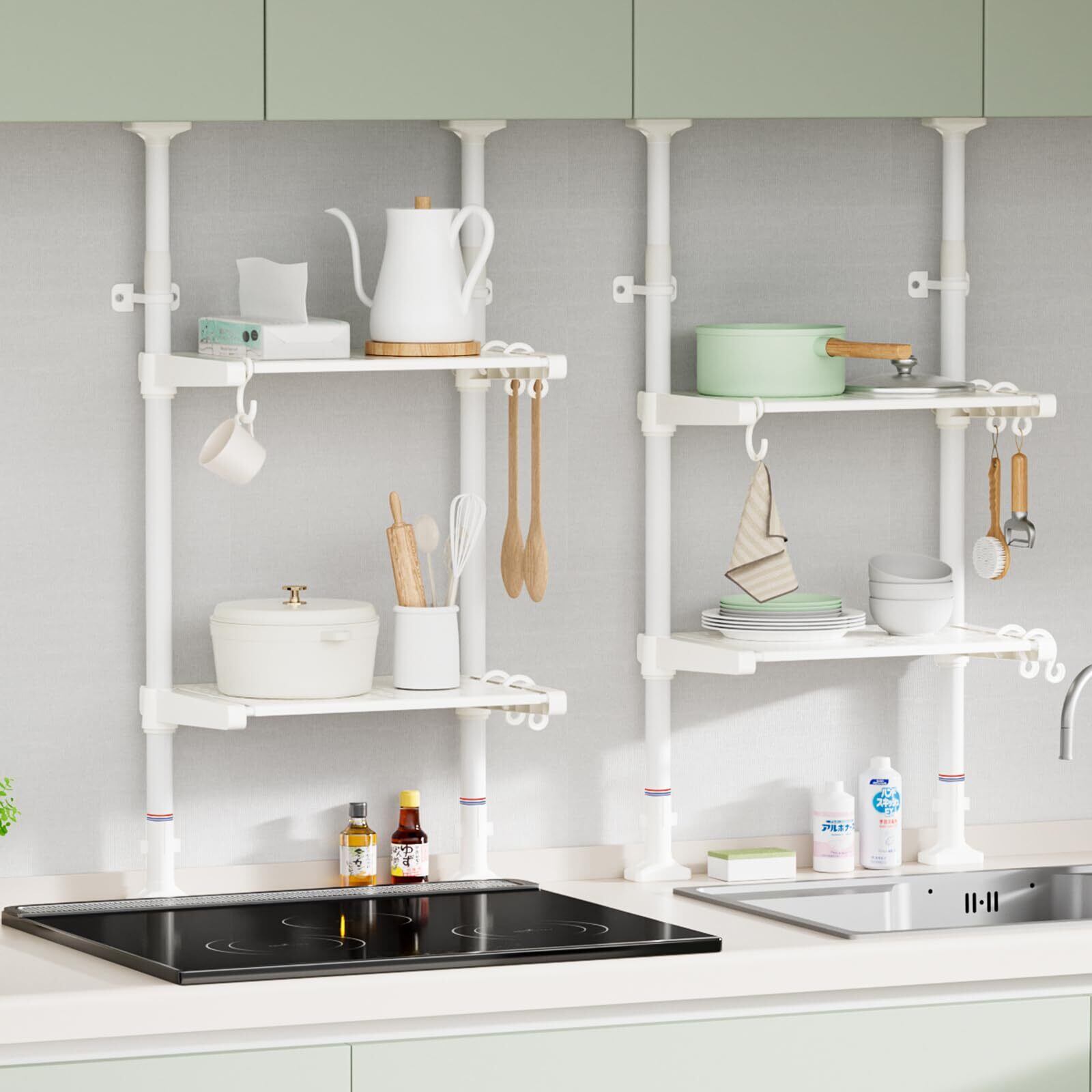 突っ張りキッチンラック 調味料ラック つっぱり式 棚高さ調節可 幅40×奥行26×高さ68~110cm 耐荷重20kg 水切りラック シンク上 キッチン つっぱり棚 ラック 2段 棚/ラッ ク両用 工事不要 窓枠につける棚 キッチンラッ ク シンク上 コンロ横 出窓 押入れ カウンター 台所 サビに強い S字フック付き スパイスラッ ク 突っ張りラッ ク