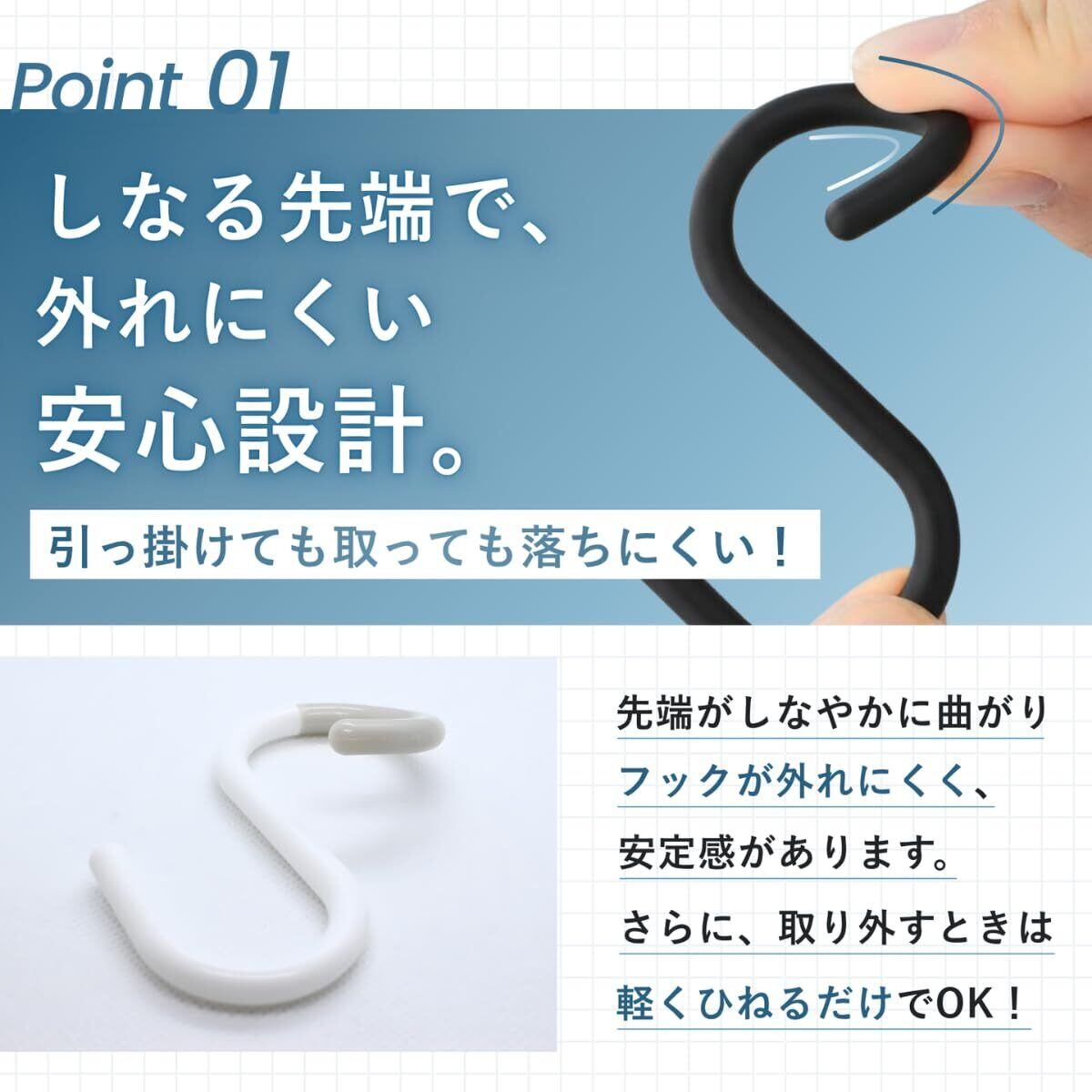 【新春セール】神戸輝き【8個入 曲がる 9cm Mサイズ】先端が曲がる S字フック 曲げて掛けられる 柔軟素材 防錆 静音 キッチン 浴室 小物掛け (8個 黒)