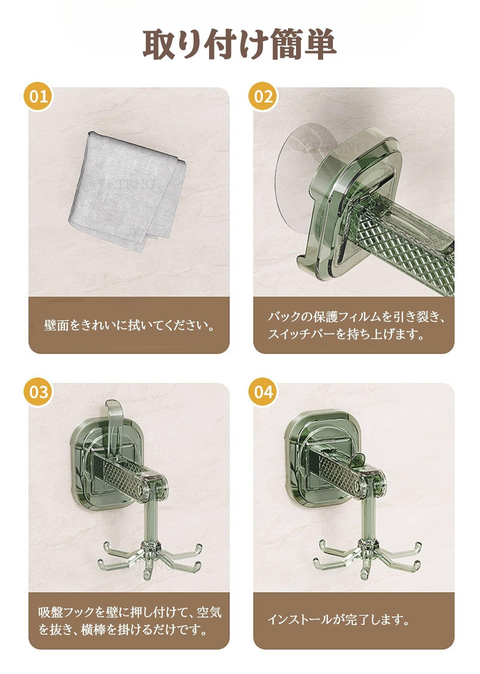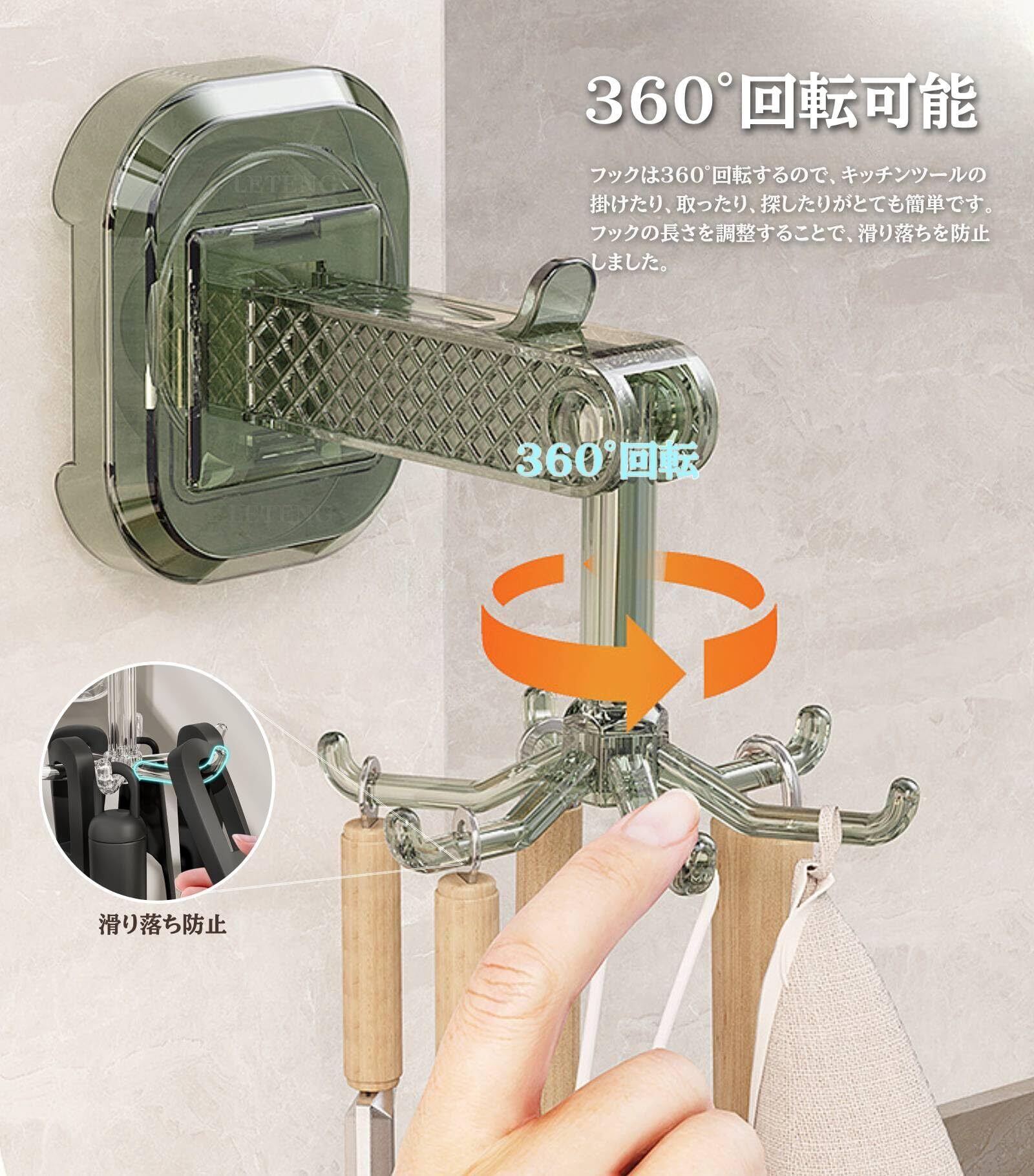 【360°回転可能】360°回転することができ、キッチン用品を探しやすく、取り出しもより便利になります。フックの端は延長設計になっており、アイテムの滑落を防止するとともに、フック自体も丸みを帯びたデザインになっており、丁寧に研磨加工を施しているため、お手に触れても安心、アイテムを傷つけることを防ぎます。