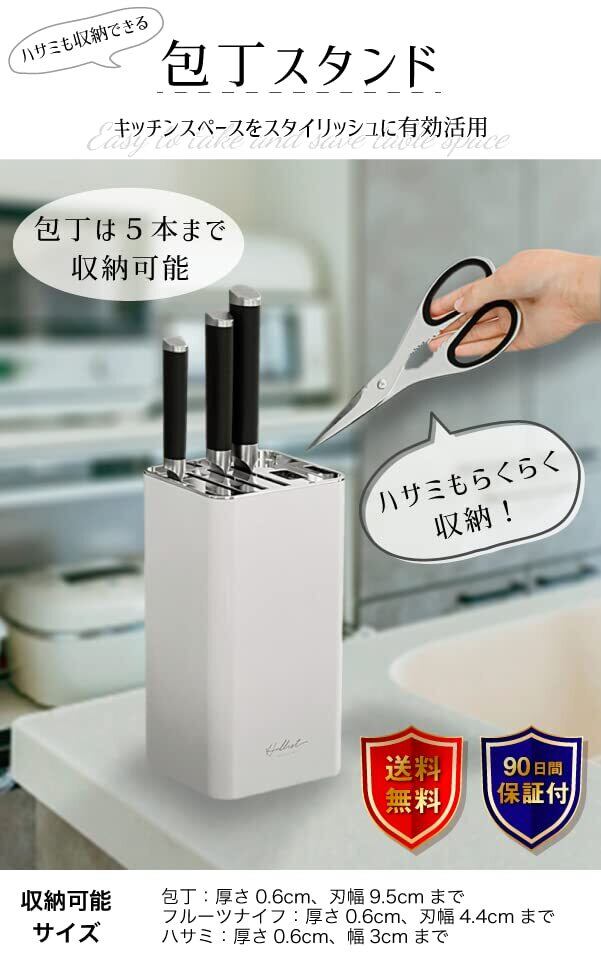 【デザイン】シンプルでスタイリッシュなデザインに仕上げております。縦長の設計で調理の邪魔にならず、キッチンをスッキリ、華やかに演出してくれます。包丁、ペティナイフ、キッチンバサミをスッキリ収納出来ます。
