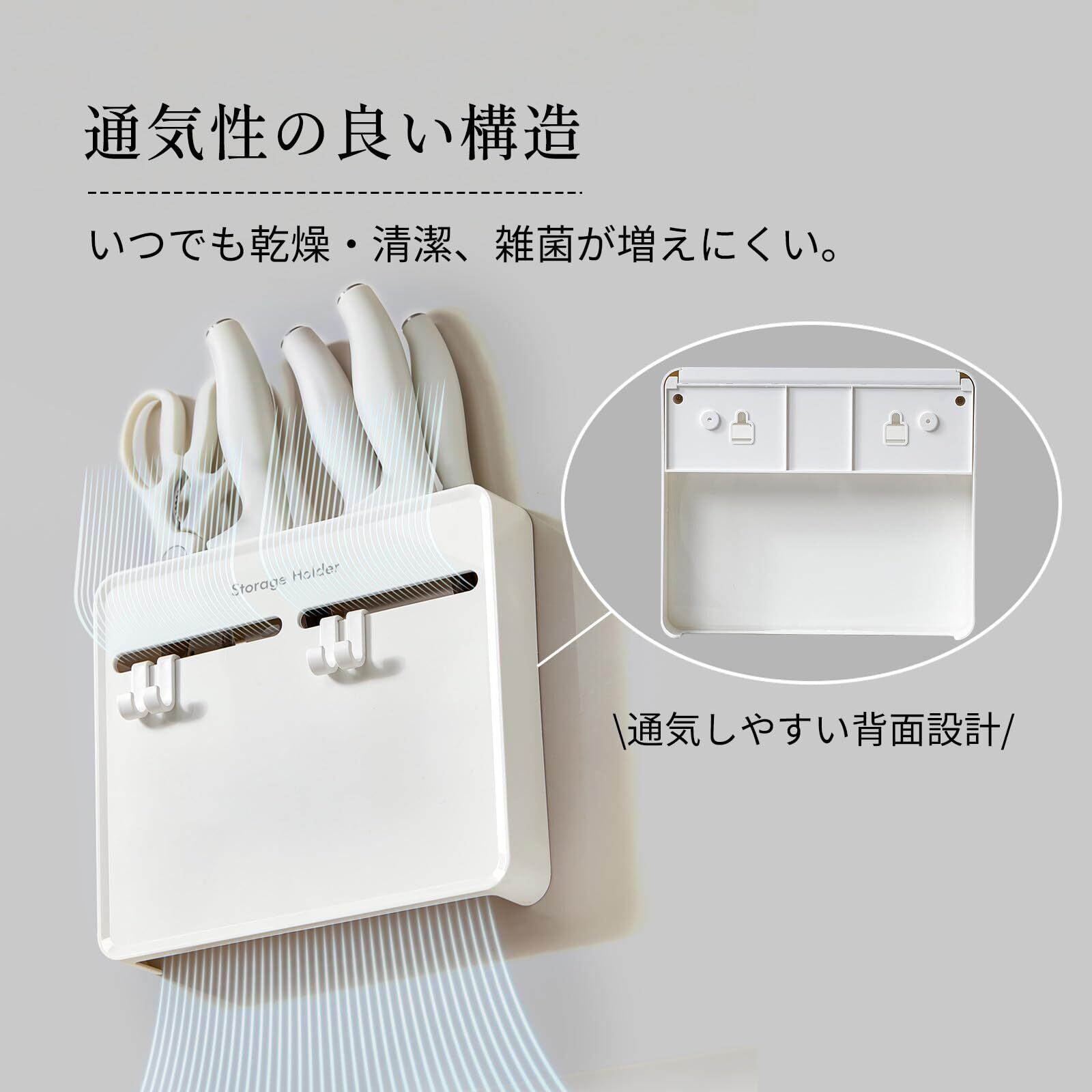 【湿気がこもりにくい通気性構造】背面にスペースを設けて空気の通り道を確保。洗った包丁も乾きやすく、湿気によるニオイやカビの発生を防ぎ、清潔な状態を保ちやすくなります。