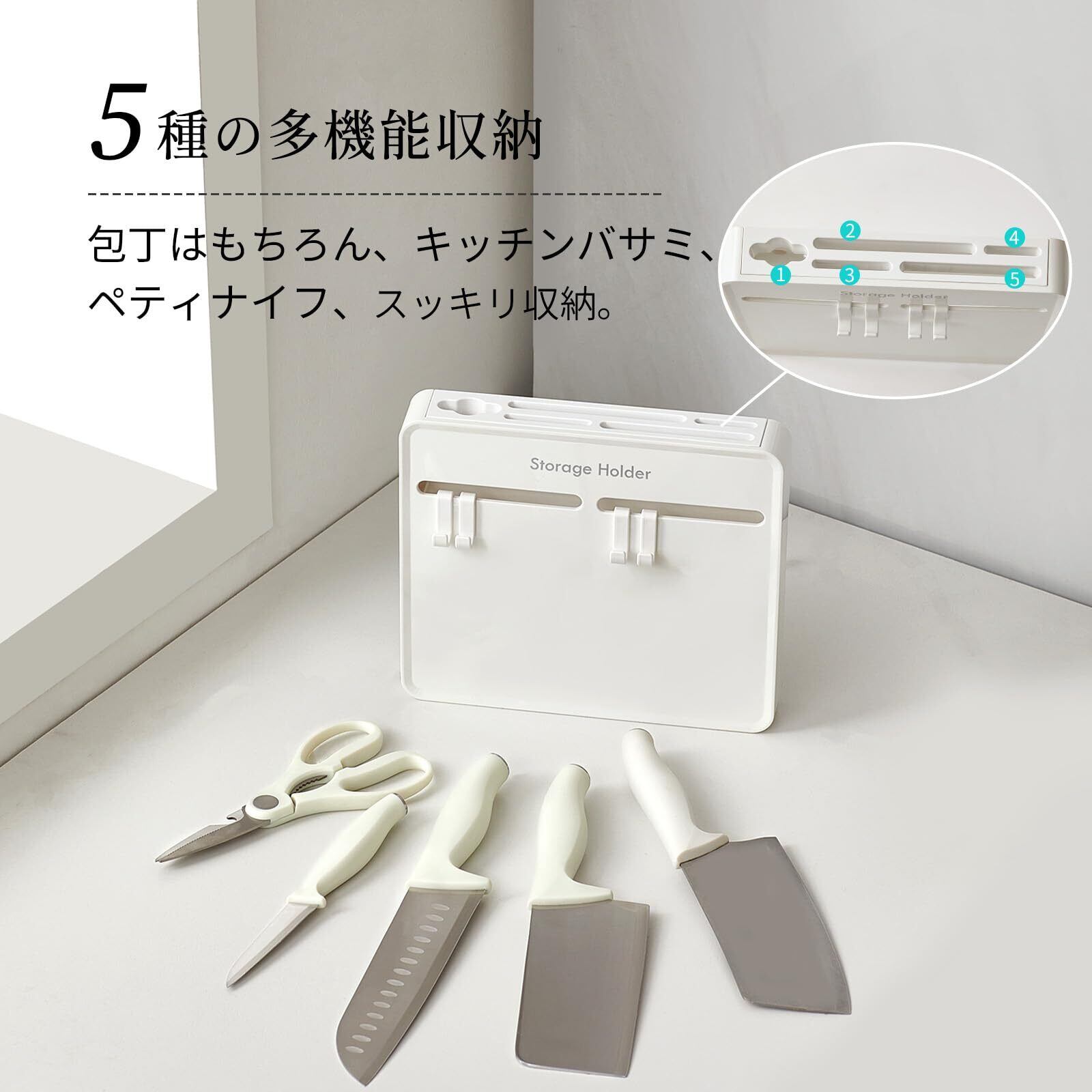 【包丁・キッチンばさみをひとまとめに収納】幅の異なるスリットを採用し、三徳包丁、菜切り包丁、牛刀、果物ナイフなど、家庭でよく使う包丁に幅広く対応。キッチンばさみ専用スペースもあり、調理中の出し入れもスムーズ。対応目安は刃幅約11cm、厚み約8mmまで。※収納本数は包丁のサイズや形状によって異なります。