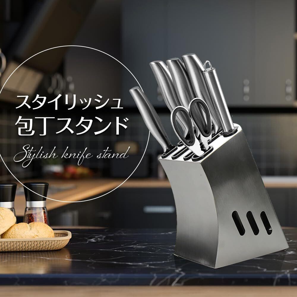 【セット内容】ステンレス鋼製包丁スタンド×1点 【サイズ(約)】10.6cm×21cm×18.8cm 【カラー】シルバー 【材質】ステンレス鋼