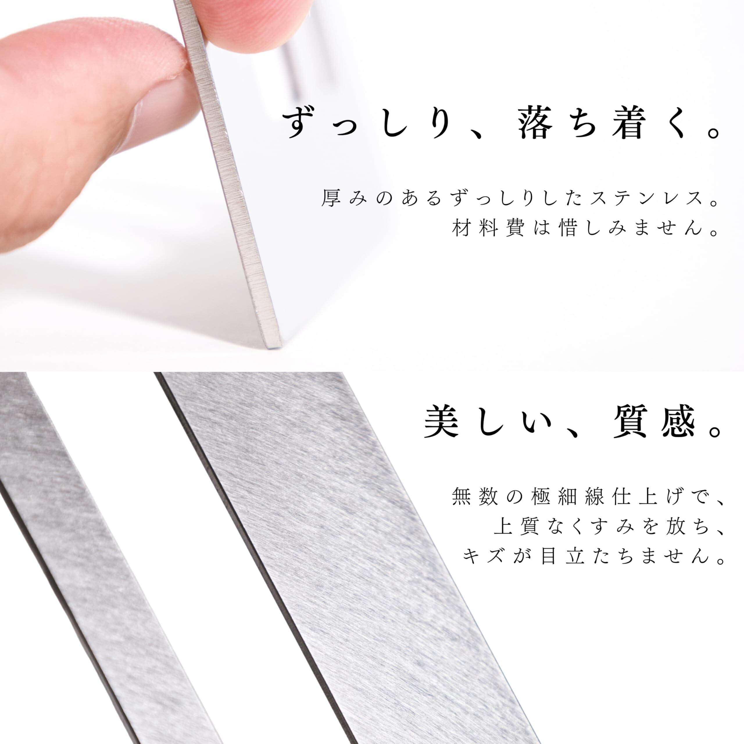 【信頼の日本製】国際品質規格認証工場のたしかな職人技で、1mm/1°以下までこだわります。無数の極細線が付くように磨き上げた表面は、落ち着きのある、上質な"くすみ"を放つ。手作業で角を丁寧に削るから、手に馴染む丸みができる。サビない、半永久的に美しい、ステンレスのある暮らしを。心を込めて。
