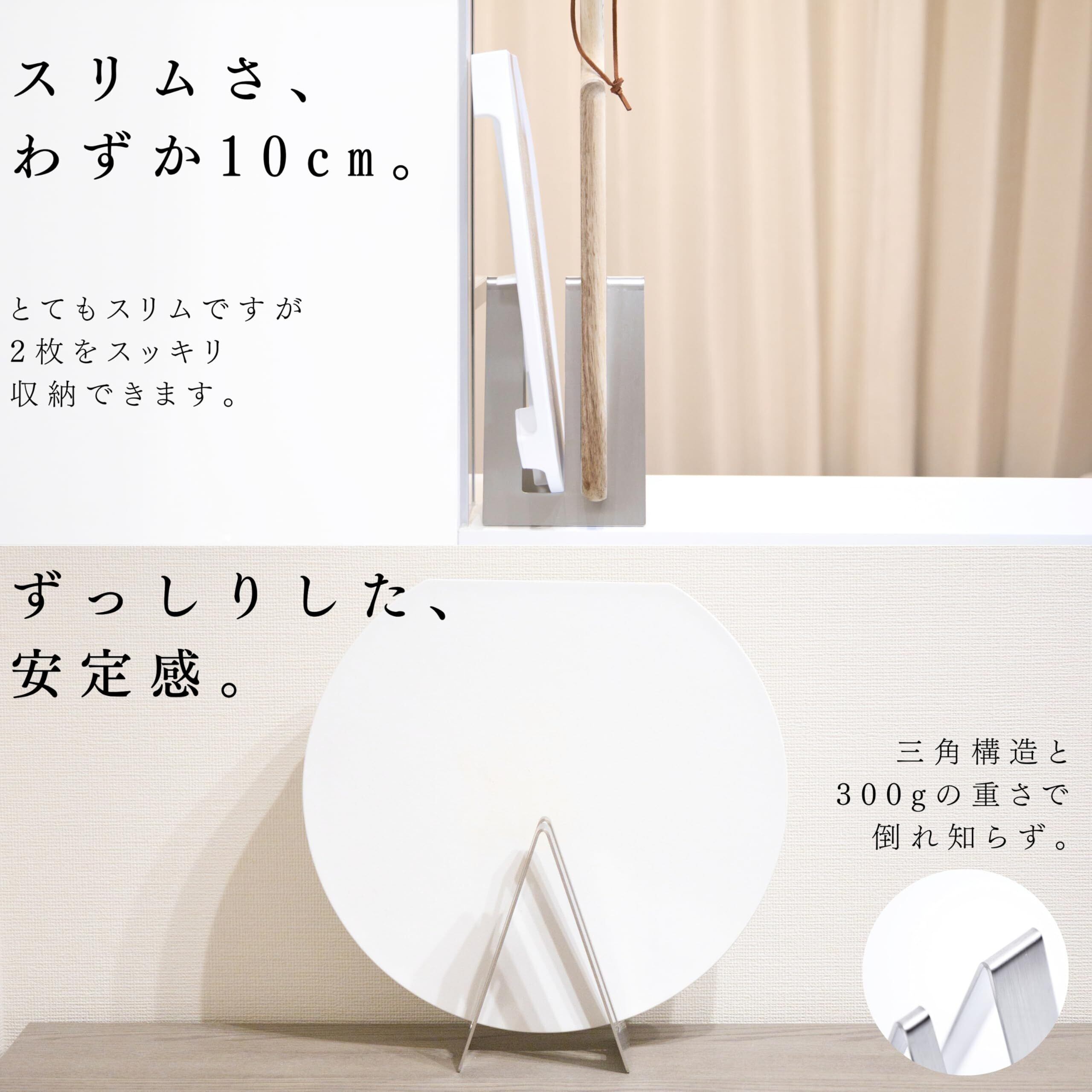 【機能性】①幅10cmのスリムなまな板たてなので場所を取りません。②1.5cmと2.5cmまでのまな板を2枚スタンドできます。③三角構造で支点が高く、重みもあるので倒れにくいです。④ステンレスなので錆びにくく、カビにくい為、衛生的です。