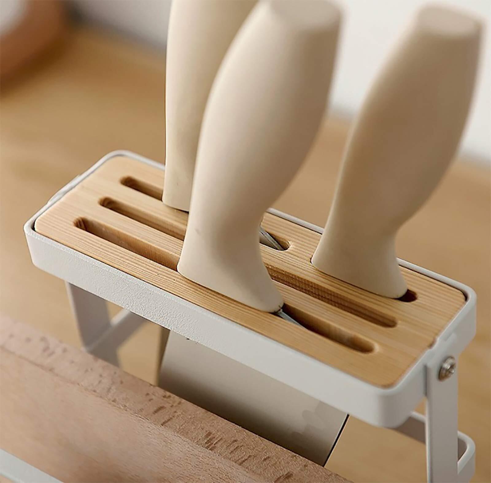 「二つの機能」:それは包丁スタンドだけでなく、まな板スタンドでもあります。まな板置きは、厚さ最大2cmまで収納可能。包丁置きは、刃渡り11cmまで収納可能。まな板または鍋蓋を2枚、包丁5~6本セットで収納できます。