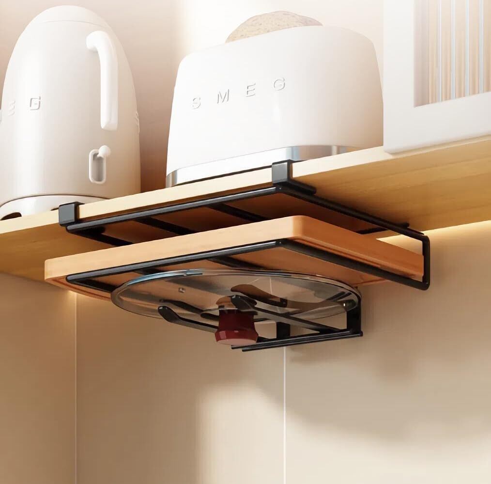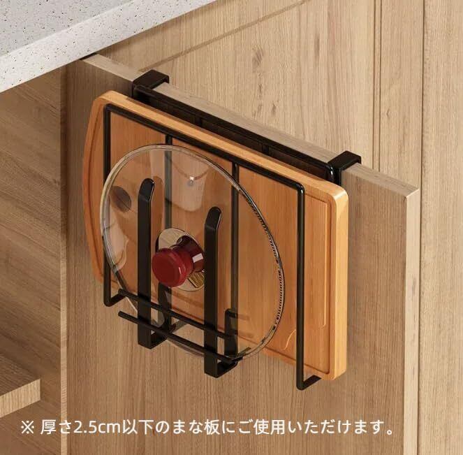 戸棚下まな板ホルダー まな板 キッチン収納 吊り下げラック 調理器具収納 省スペース フック付き 布巾ハンガー キッチンペーパーホルダー 錆びにくい 取り付け簡単 ブラック (まな板収納+鍋ぶたラック)