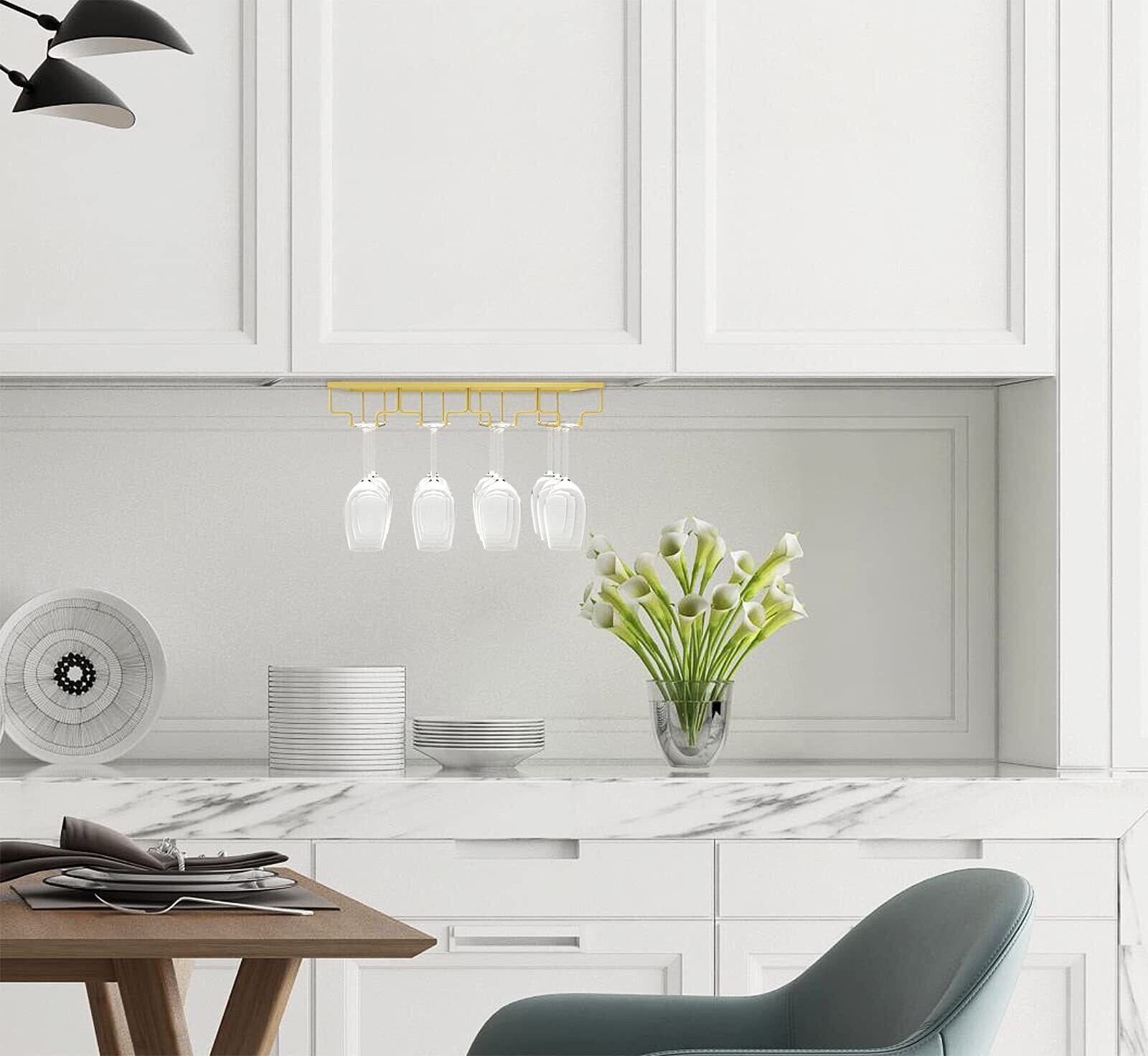 「吊り下げ式」 収納口にワイングラスの台座を引っ掛けて吊り下げる形で収納、キッチンの棚に固定して吊り下げ式でスペースを有効活用。