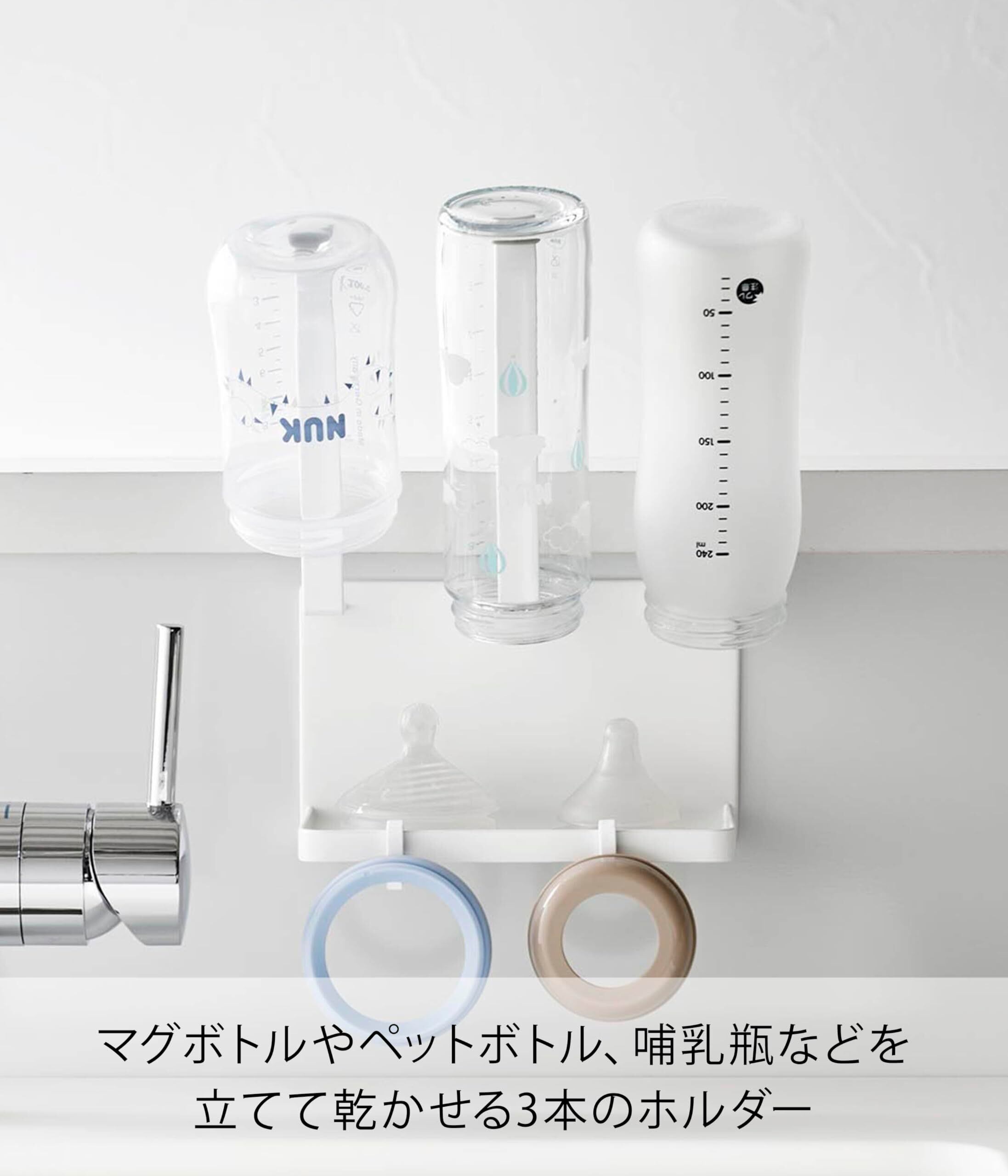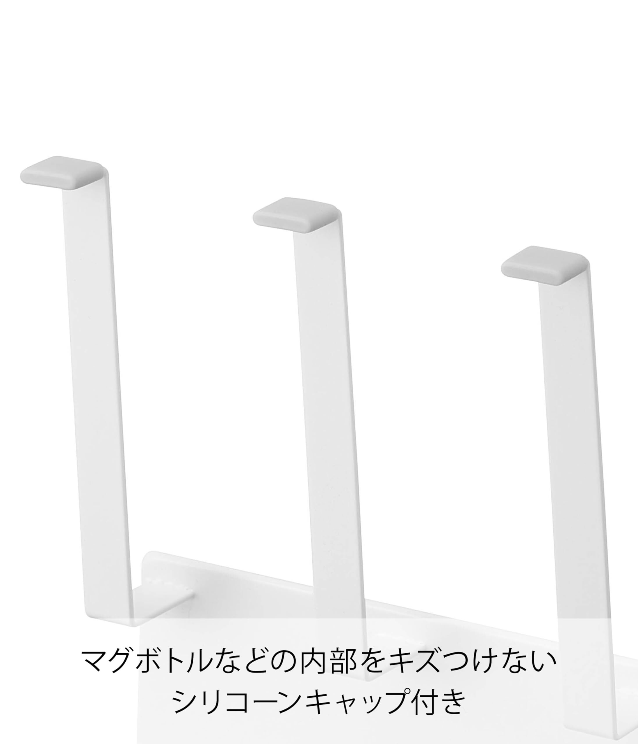 ■使用できる面:マグネットがつく平らな面・スチール面 ■特徴: マグネットがつくスチール面に簡単取り付け。 マグボトルやペットボトル、哺乳瓶なんどの付属品も一緒に干すことができます。 トレーに付属のフックを取り付ければパッキンなどを干すのにも便利です。 ホルダーにはシリコーンキャップが付いているのでマグボトルなどの内部をキズつけません。
