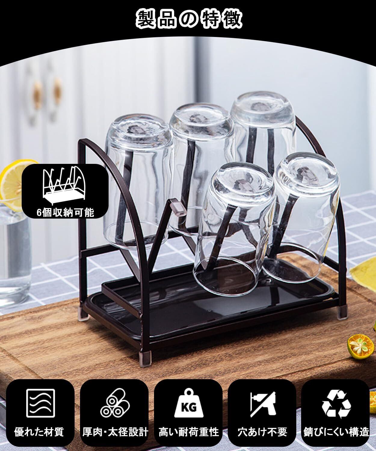 カップホルダー ガラス乾燥ラック シリコーン コップスタンド 水切りスタンド 6個掛け り止め付き 省スペース 排水トレイ付き グラス置き 乾燥用