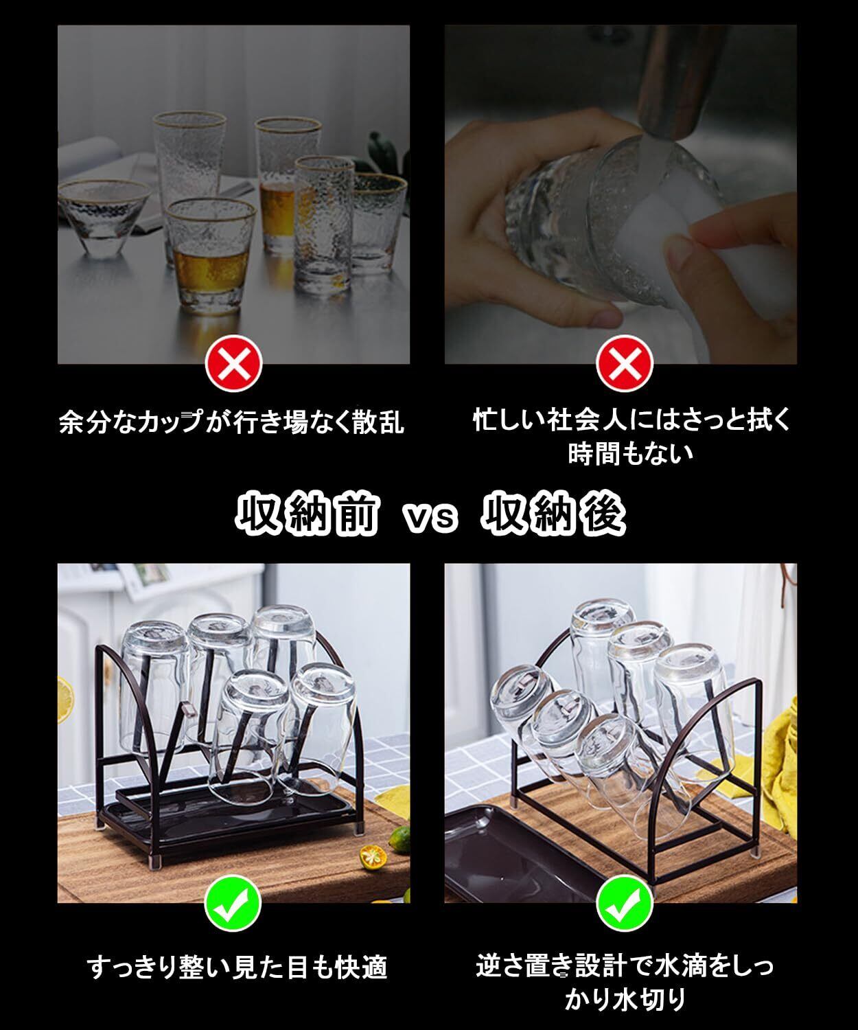 ️ 【急速水切り】科学的に配置されたアームで空気循環を促進。カップを逆さに吊るすことで急速な水切りを実現。主流のカップ口径に対応し、カウンターの乾いた状態を持続維持。