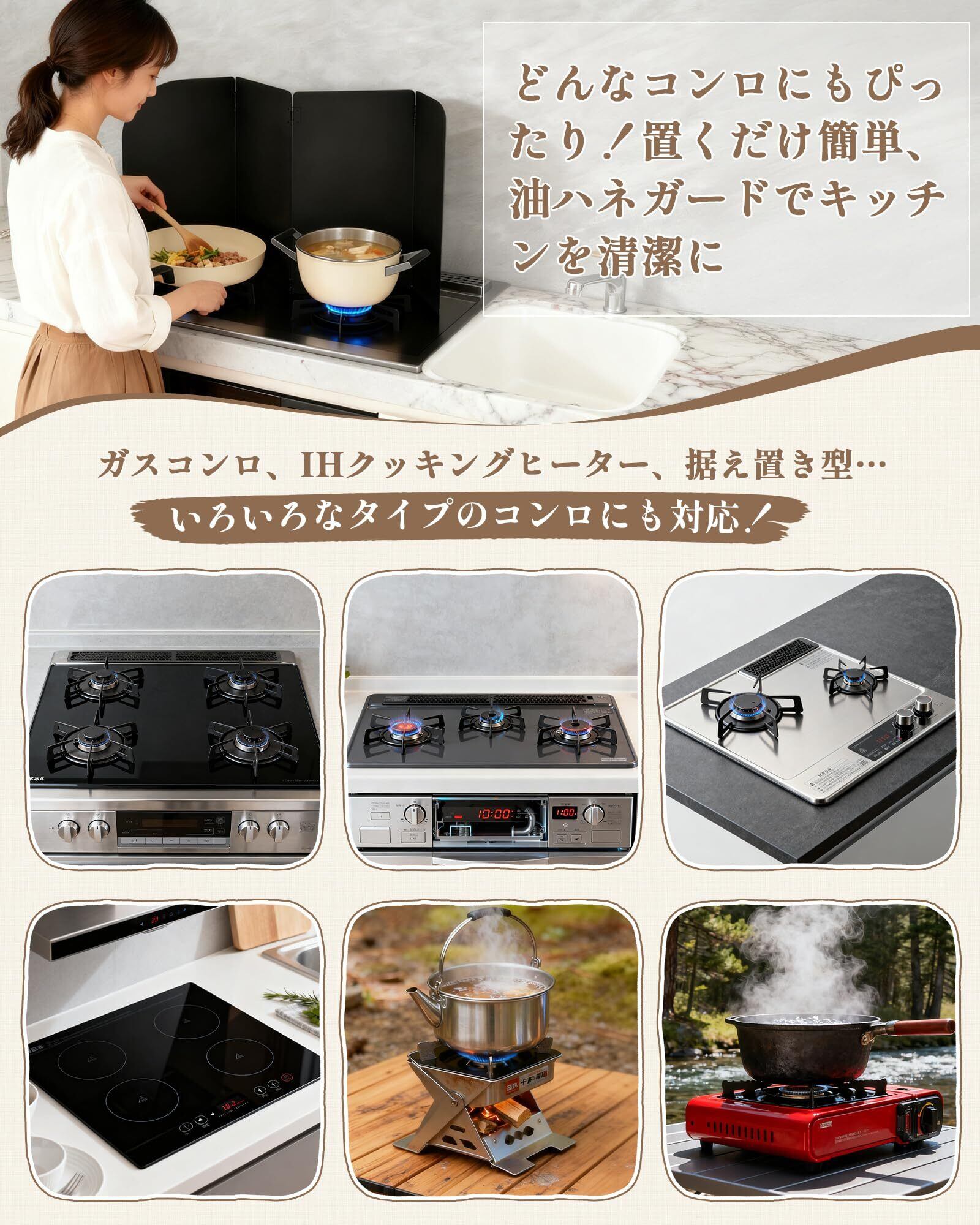 【IH・ガスコンロ両用!安定感抜群の設計】 IHコンロ、ガスコンロのどちらにも対応する万能コンロガードです。厚みのある素材としっかりとした構造で、調理中の熱や衝撃にも強く、安定感は抜群。縁取りは滑らかで、安全にご使用いただけます。キッチンでの油汚れ 汚れ防止はもちろん、アウトドアでの風防としても活躍する、多機能さが魅力です。