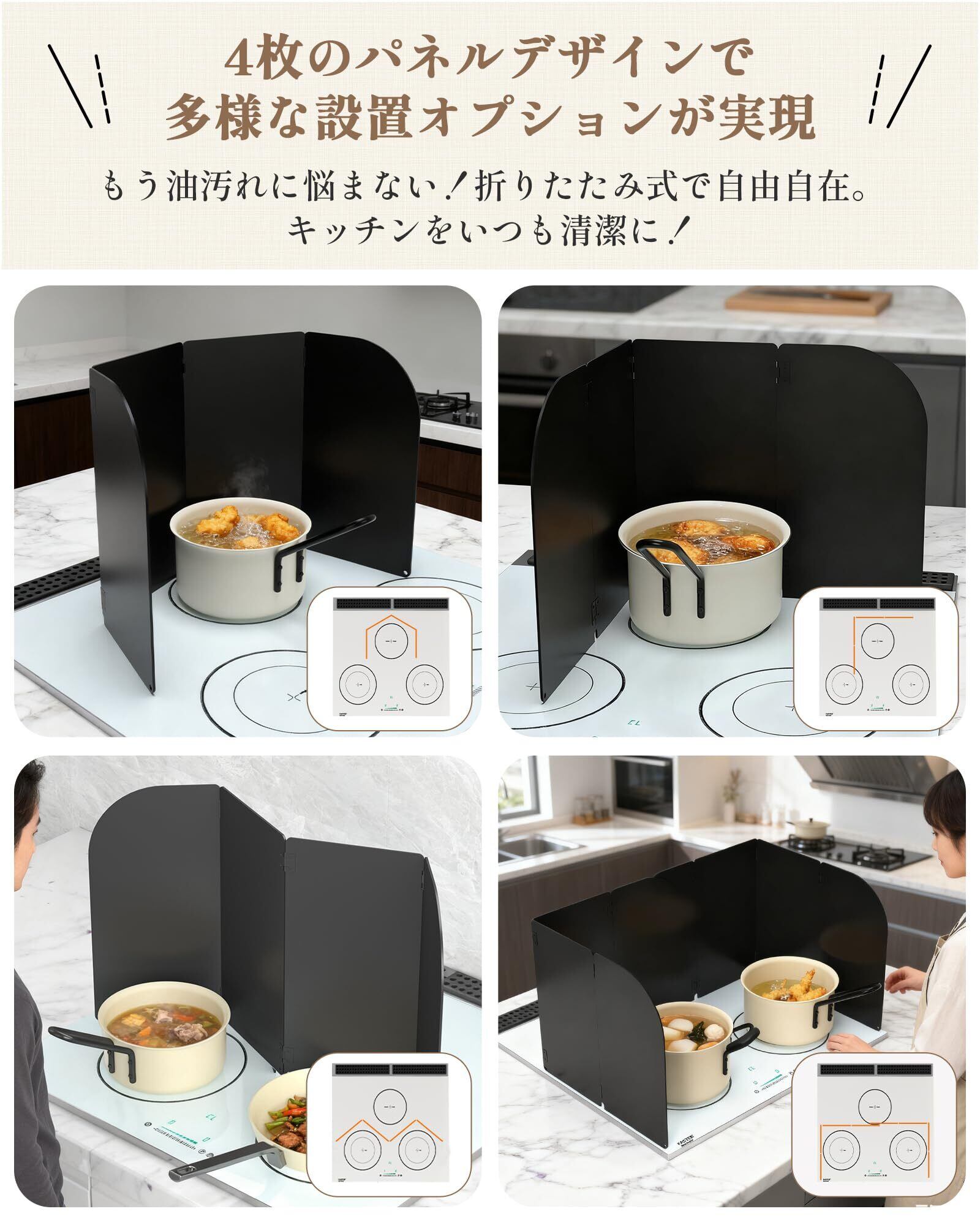 【93%以上油はねカット!調理中のストレス軽減】 当社のレンジガードは、調理中の油はねをしっかり防ぎ、IHコンロやガスコンロを清潔に保つための必需品です。4枚のパネルが自由に展開でき、IHコンロでもガスコンロでも、調理中の油汚れや汁はねをしっかりガードし、キッチンの壁やコンロ周りを清潔に保ちます。もう、毎日の油汚れ掃除に悩む必要はありません。