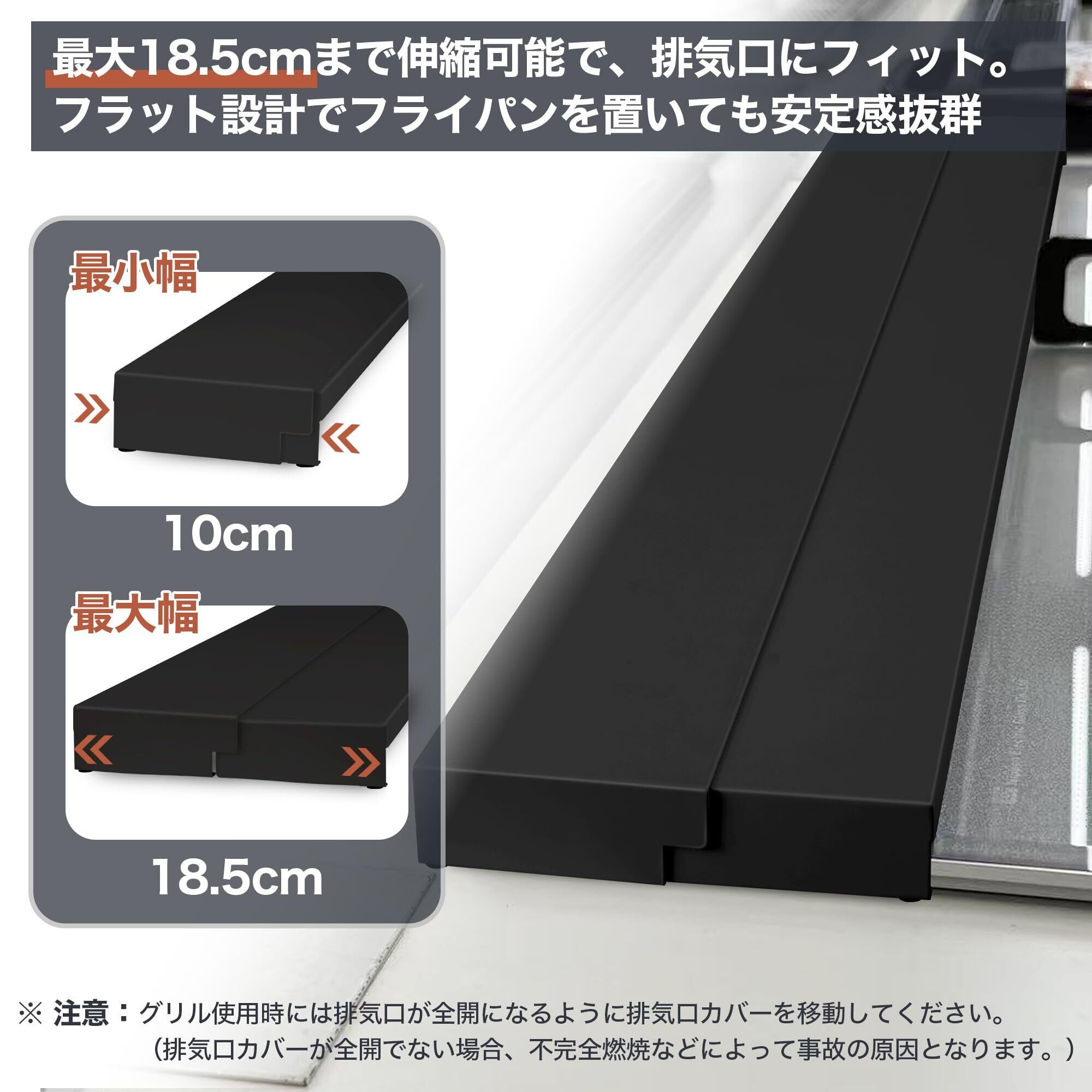 【伸縮してぴったり設置】奥行きは 10~18.5cmの範囲でスムーズに調整可能なので、設置場所にぴったりフィットします。コンロ奥の壁から排気口までの隙間をしっかりカバーし、汚れの付着を防ぎます。最大18.5cmまで伸ばせば、大きめの鍋やフライパンの一時置きとしても活用できます。※ グリルをご使用の際は、必ずスライド部分を縮めて排気口のすべてを開放してご使用ください。