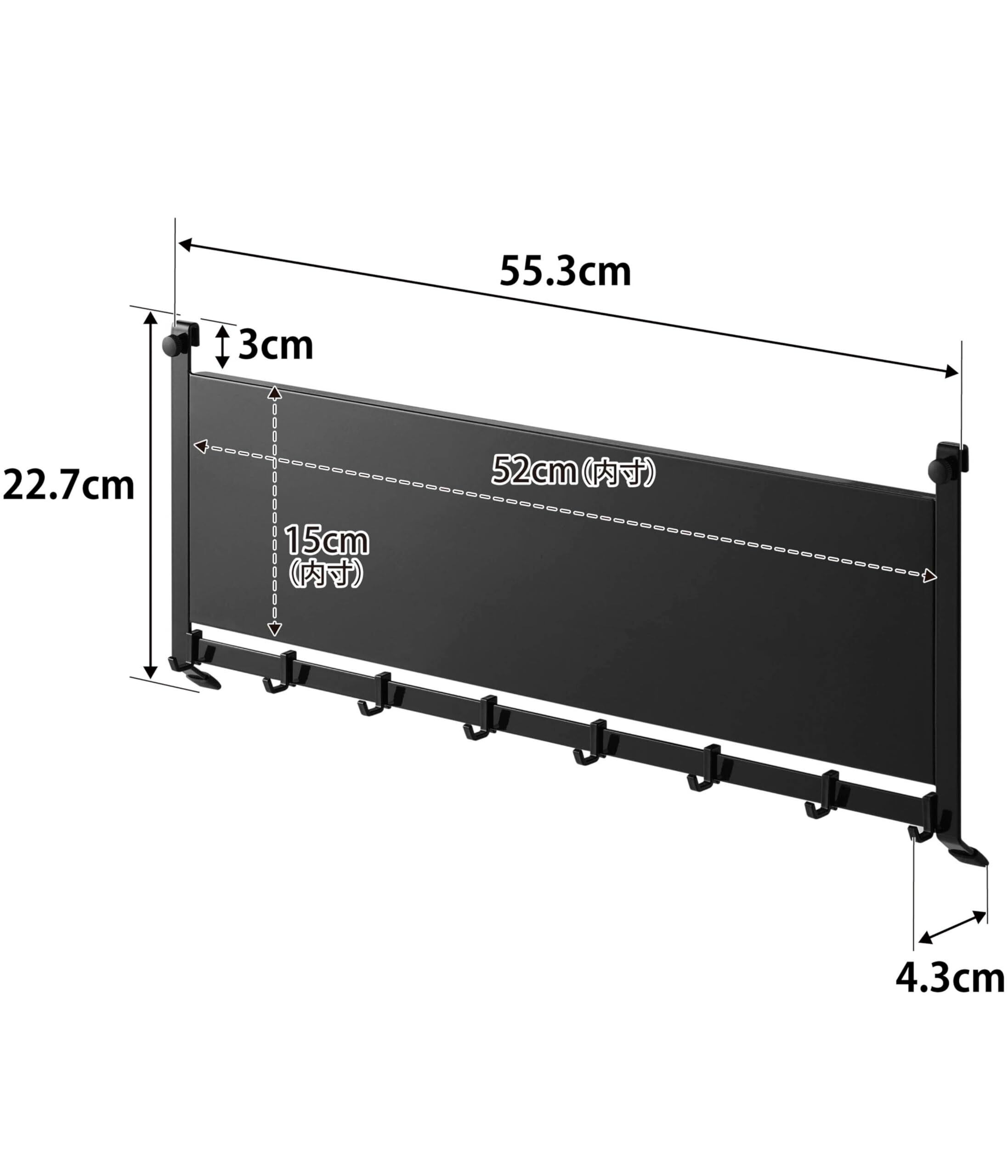 マグネットアイテムや付属のフットを取り付けて自由に組み合わせができるスチールパネル。 便利なレンジフード下収納。 ■商品サイズ(cm):W55.5×D4.3×H22.7(フック含む) ※製品によって仕上りサイズに多少の誤差がありますのでご了承下さい。 ■品質表示: 本体/スチール(粉体塗装) クッション/シリコーン ■付属品:フック8個 ■耐荷重: パネル/2kg パネル下バー/2kg(フック1つあたり250g)