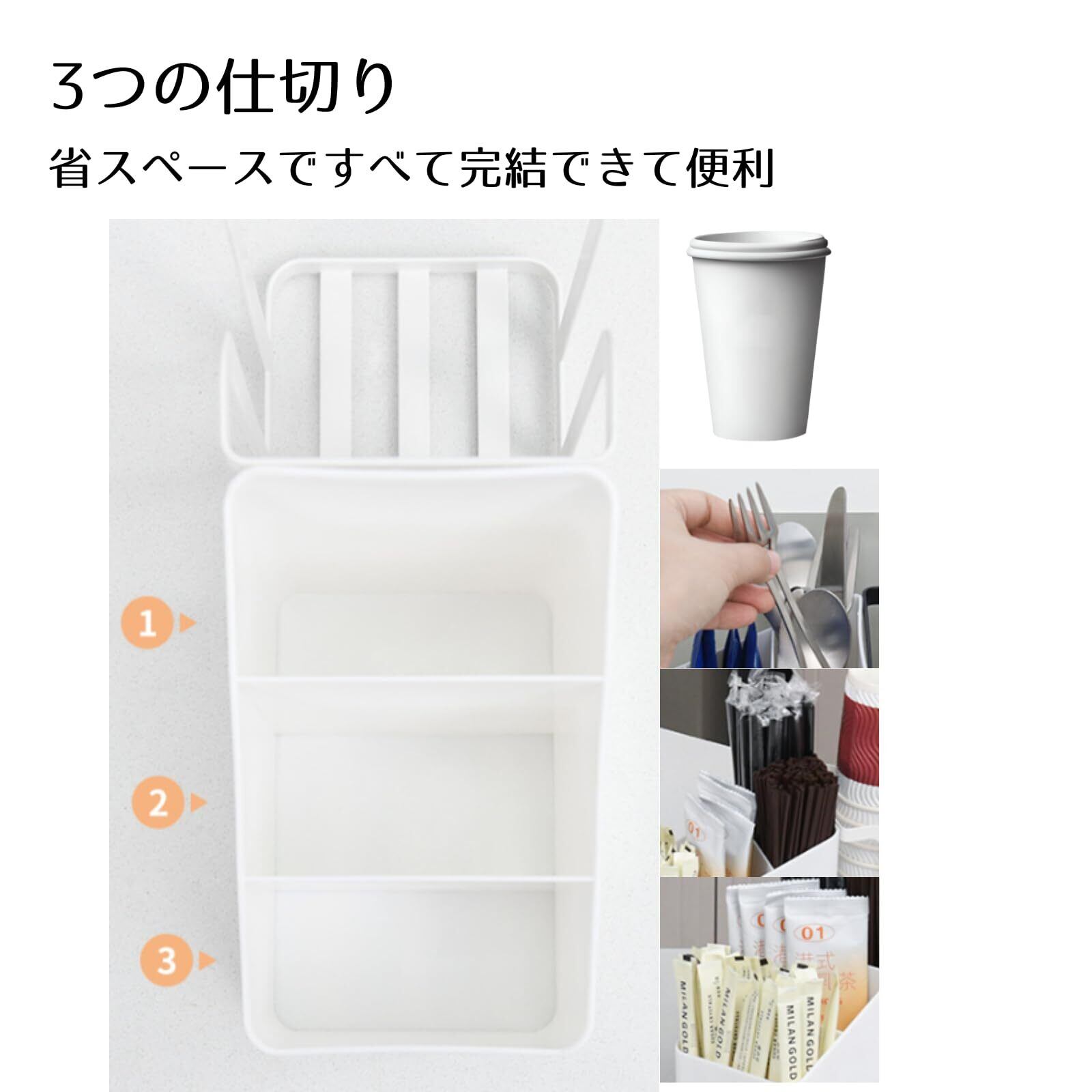 【3つの仕切り】紙カップ置き場の他に、3つの仕切りがあるので、シュガースティック、コーヒースティック、マドラー、ストローなどまとめて収納できるので、省スペースですべて完結できる便利な商品になります。