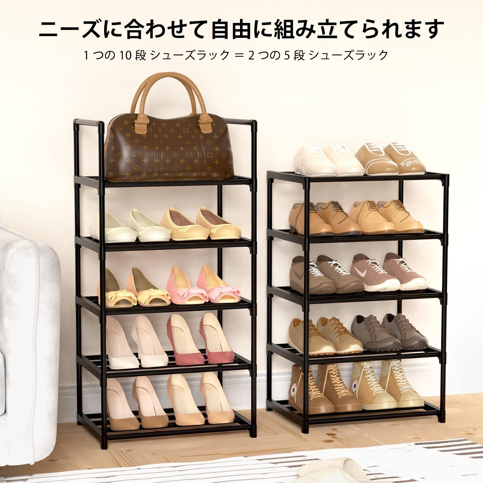 【拡張・分割可能なシューズ棚】同商品を 2 点購入して組み合わせれば、家族全員の靴をまとめ収納できる大型ラックに変更可能。1 層または複数層を取り外すことで、ブーツ、ハイヒール、その他大きな小物を収納し、様々なシーンに対応。10 段シューズラックは 2 台の 5 段ラックに分割可、1 台は玄関に、残りはクローゼットや寝室に配置するなど、使い方自由。混雑した玄関や収納スペースを散らかりから守る最適なソリューションです。