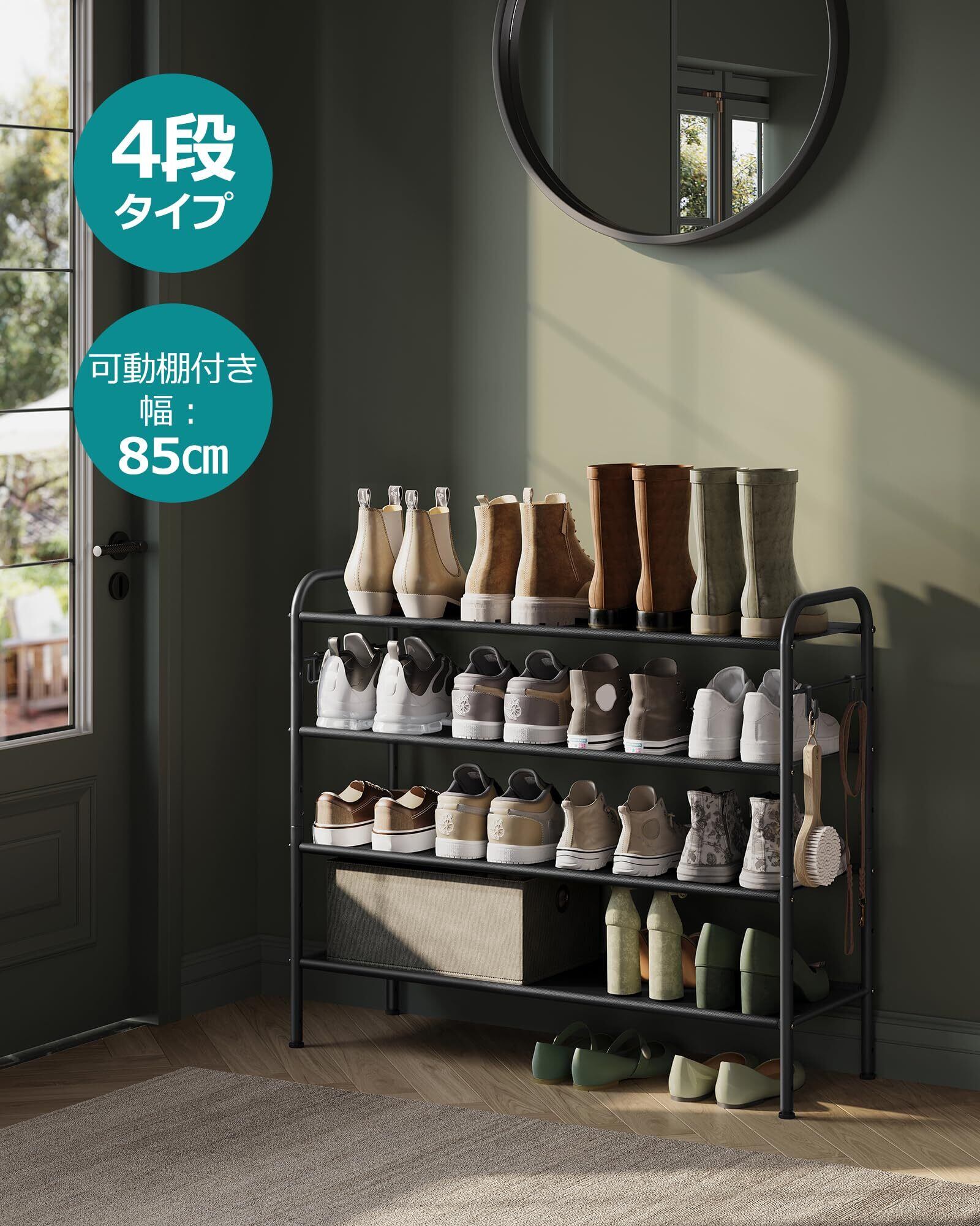 SONGMICS シューズラック 省スペース おしゃれ 4段 靴 スリム 高さ調節可能な棚 布製 サイドフック付き 玄関 廊下 幅85cm 靴箱 玄関 靴ラック ブラック LMR149B01