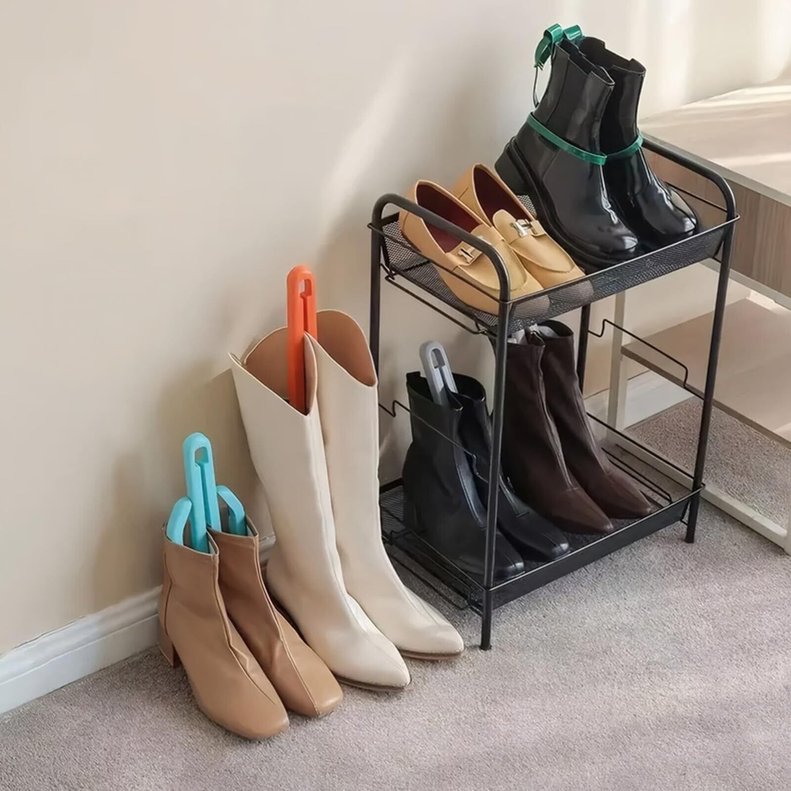 【折りたたみ式で持ち運び可能】:ブーツラックは簡単に折りたたんで収納スペースを節約でき、ロングブーツとショートブーツの両方に使用できます。 上部の吊り下げ穴のデザインは旅行や自宅の保管に便利です。