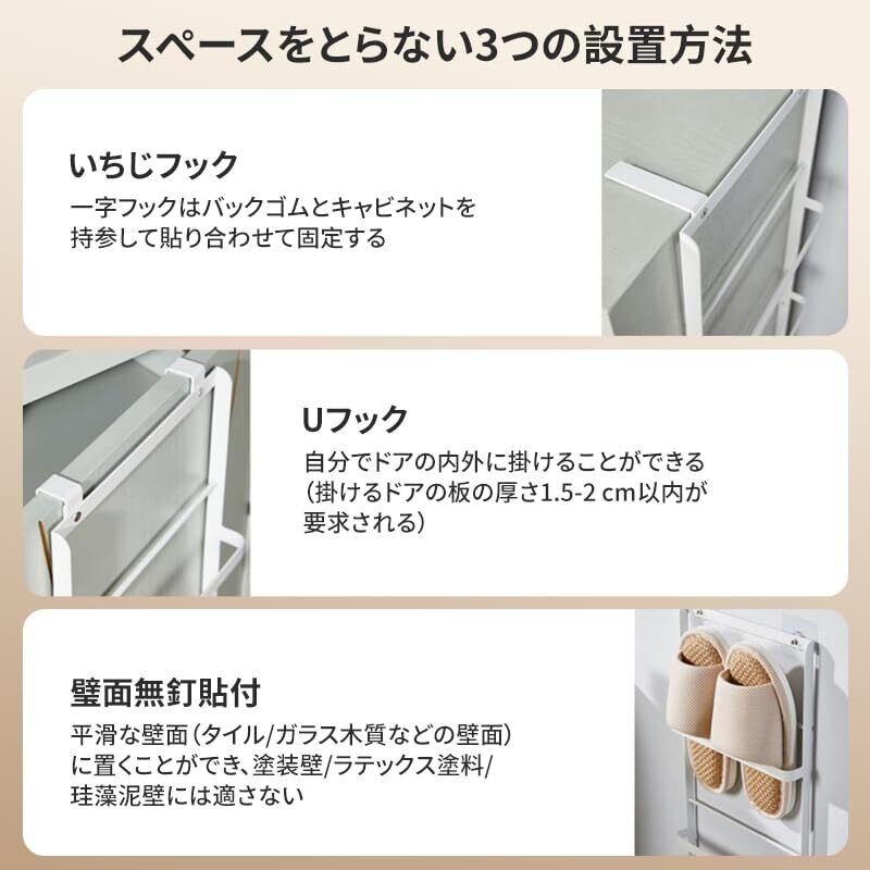 【取り付け簡単】U字フックのデザインで 簡単にスリッパをラックに掛けることができます。様々な取り付けオプションがあり、ネジ止めや突っ張り取り付けなど 、様々な環境に適しており、玄関や洗面所を広々と使えます。