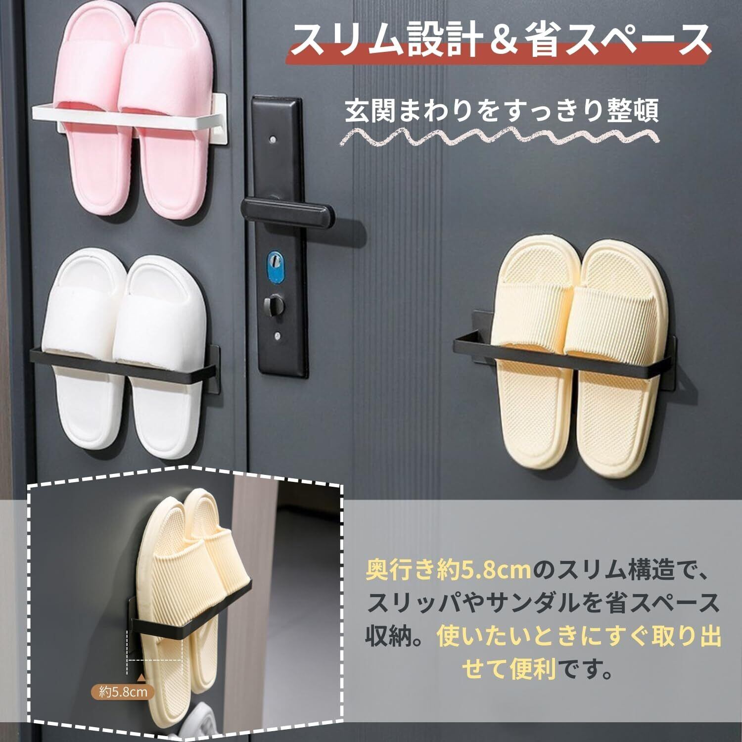 【スリム設計&省スペース】玄関まわりをすっきり。整頓奥行き約5.8cmのスリム構造で、スリッパやサンダルを省スペース収納。使いたいときにすぐ取り出せて便利です。