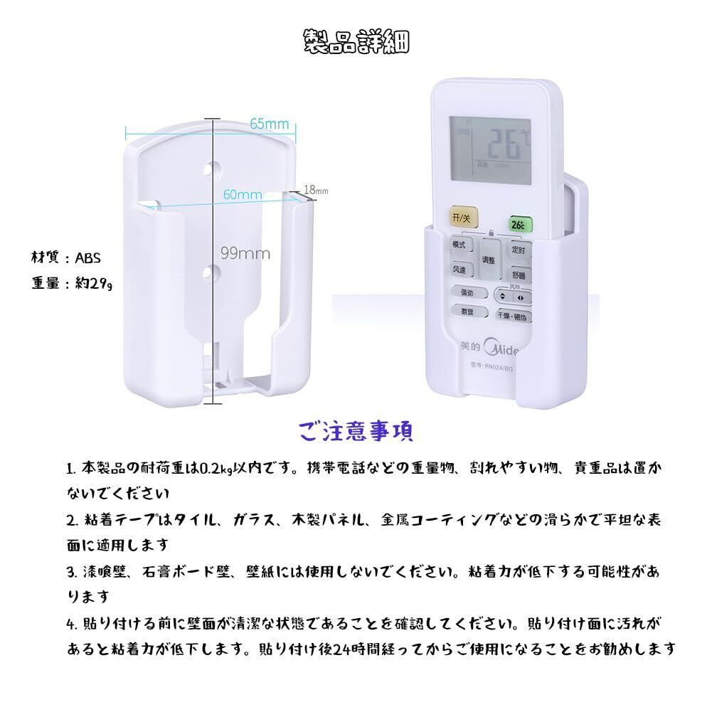 1.【高品質な素材と精密な仕上げ、卓越した質感】 ABS素材を採用し、表面は滑らかでバリや嫌な臭いがありません。細部まで行き届いた丁寧な仕上がりで高品質を実現。開口部の設計も滑らかで、リモコンの出し入れが引っ掛からず、長期間使用しても変形しにくいため、リモコンにとって安全で確実な「居場所」を提供します。 2.【2種類の取り付け方法、多様な壁面に対応】 3M強力粘着テープとネジ止め部品の両方を同梱。ご自身のニーズに合わせて取り付け方法を選択できます。タイル、ガラス、木材、金属などの平滑な表面にしっかりと密着します(注意:漆喰壁、石膏ボード壁、壁紙貼りの壁への使用はお勧めしません)。取り付け前は壁面を清潔で乾いた状態にし、貼り付けた後は24時間経ってから使用してください。抜群の安定性で、落下の心配はありません。 3.【多様なシーンで万能、様々なリモコンを"きちんと収納"】 これは万能的なリモコン収納ソリューションです!テレビ、エアコン、扇風機、インターホン、セットトップボックスはもちろん、キッチンキャビネットライトのリモコンなど、様々なものに対応。一つの製品で多用途に活用でき、無駄がありません。寝室、リビングからキッチン、ホテルなどのシーンにもすっきり融合し、あらゆる空間のリモコンに専用の「駐車場」を提供します。 4.【壁掛け設計で散らかりを解消、空間を節約して整理整頓】 従来の置き型を打破する壁掛け設計で、リモコンを直接「壁に」収納。テーブルの上やソファの隙間などでリモコンを探し回る煩わしさに別れを告げましょう。住まいにより多くの空間をもたらし、リビングや寝室をより整然と秩序立てます。狭小住宅でも簡単に収納アップグレードを実現できます。 5.【細部への気配り、コンパクトで軽量、どんなスタイルにも馴染む】 底面の開口部デザインにより、リモコンの出し入れがらくらく。1個の重量は約29gと非常に軽量で場所を取りません。シンプルな白色の外観は、モダン、北欧、和風など、あらゆるインテリアスタイルに調和します。単なる収納ツールではなく、目立たないさりげないデザイン要素としても機能します。