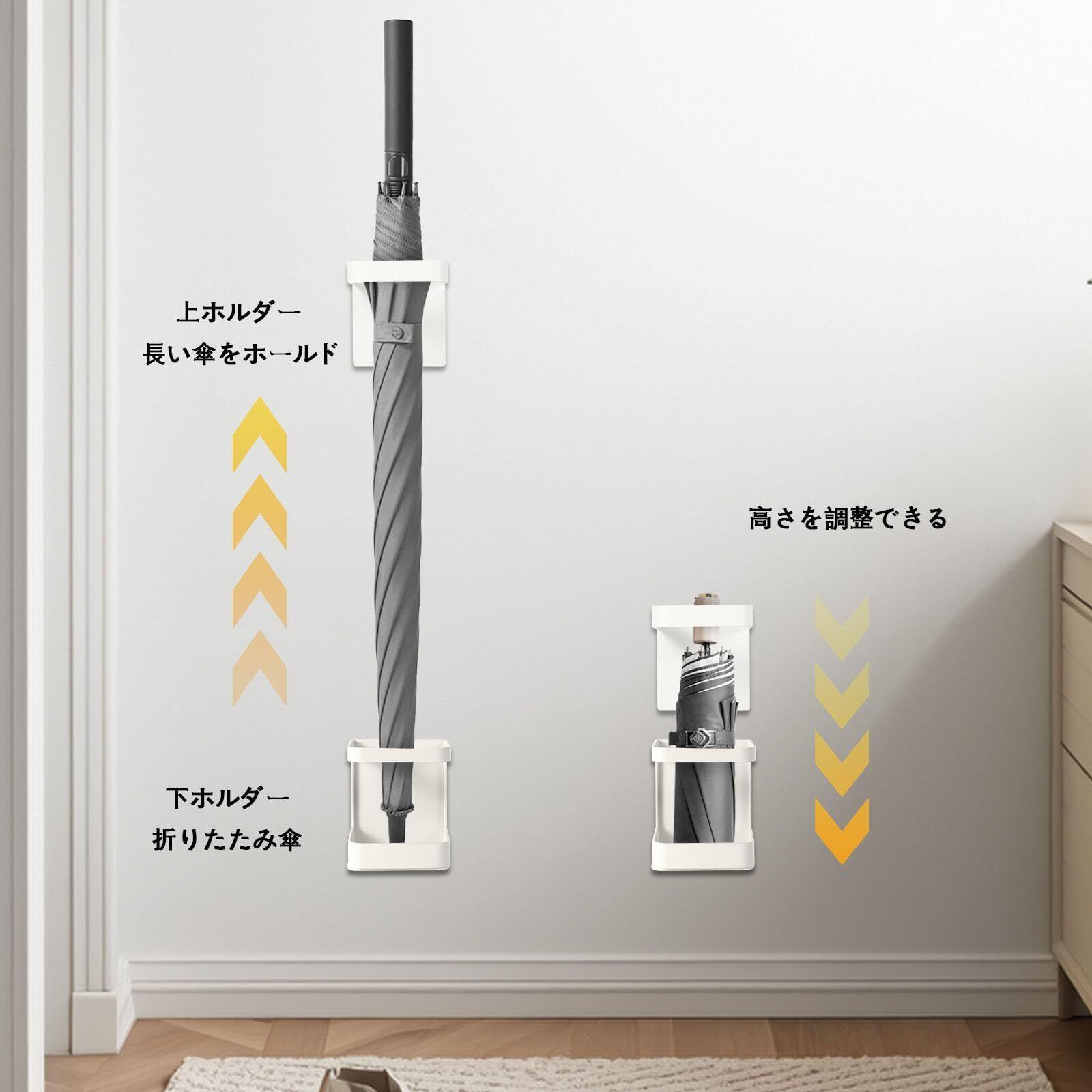 長傘、折りたたみ傘の両方を収納可能: 上下のホルダーで傘を支えます。お手持ちの傘の長さに合わせて、取付位置を調節してお使いください。