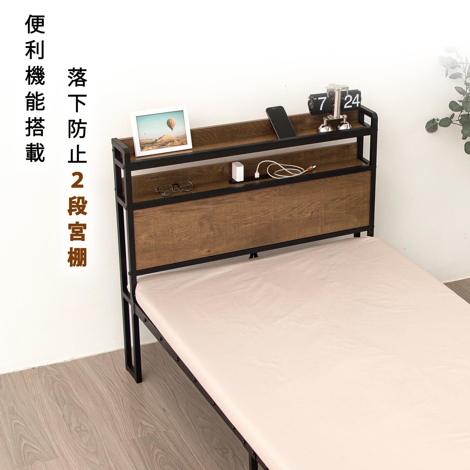 【便利機能満載の2段宮棚】2口コンセント&USBポート付きで就寝中の充電はもちろん、ライトスタンドの設置も可能!宮棚の後部に落下防止構造でモノ落ち心配なし!さらにスマホスタンド機能も搭載しているもっとにお使いやすくなる!