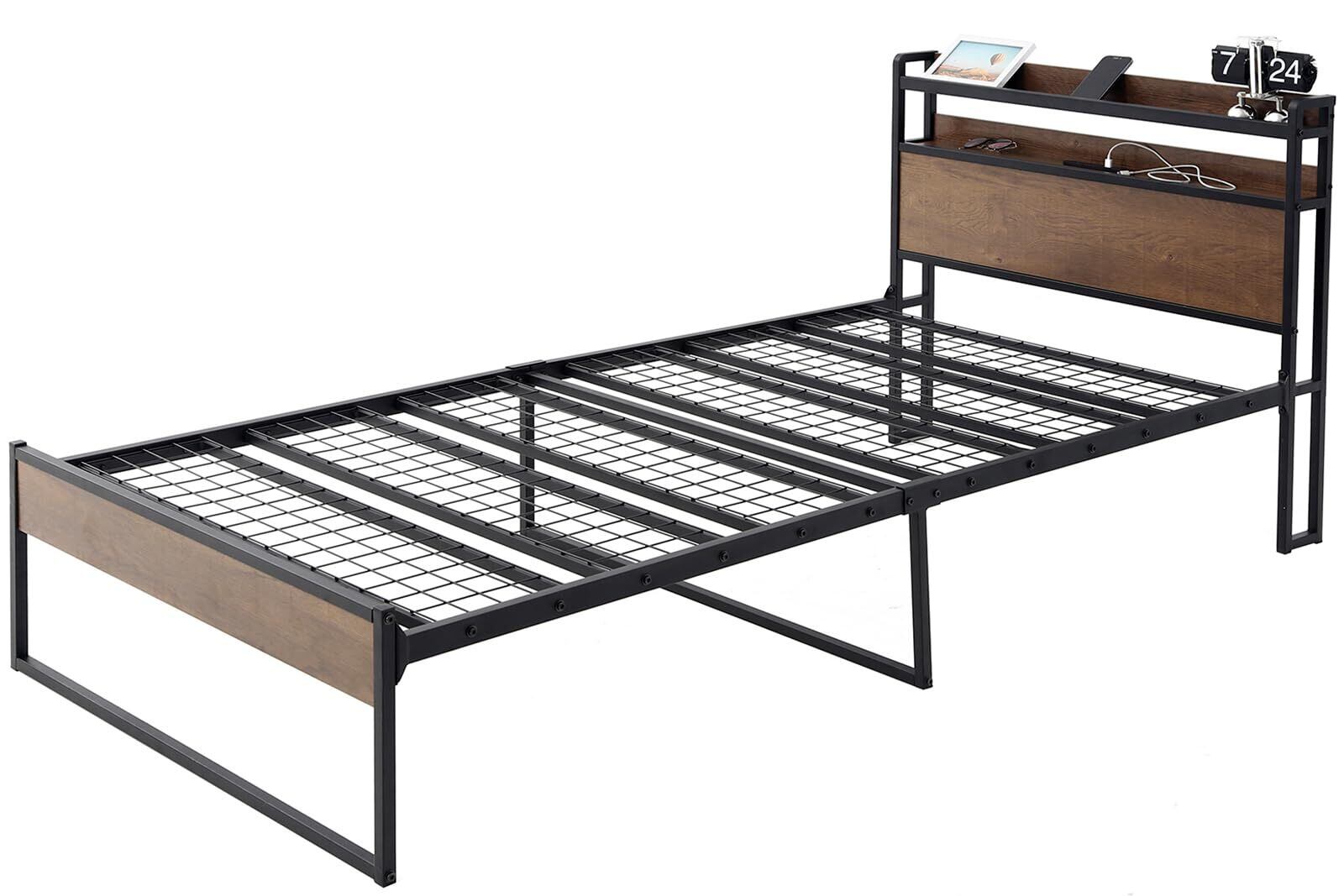 USB&2コンセント ベッドフレーム 2段宮棚付き パイプベッド 高耐荷重 収納付き スチールベッド カビ防止 アイアン 脚付き フレームのみ シングルベッド 頑丈 木製 (ウォールナット×ブラック)