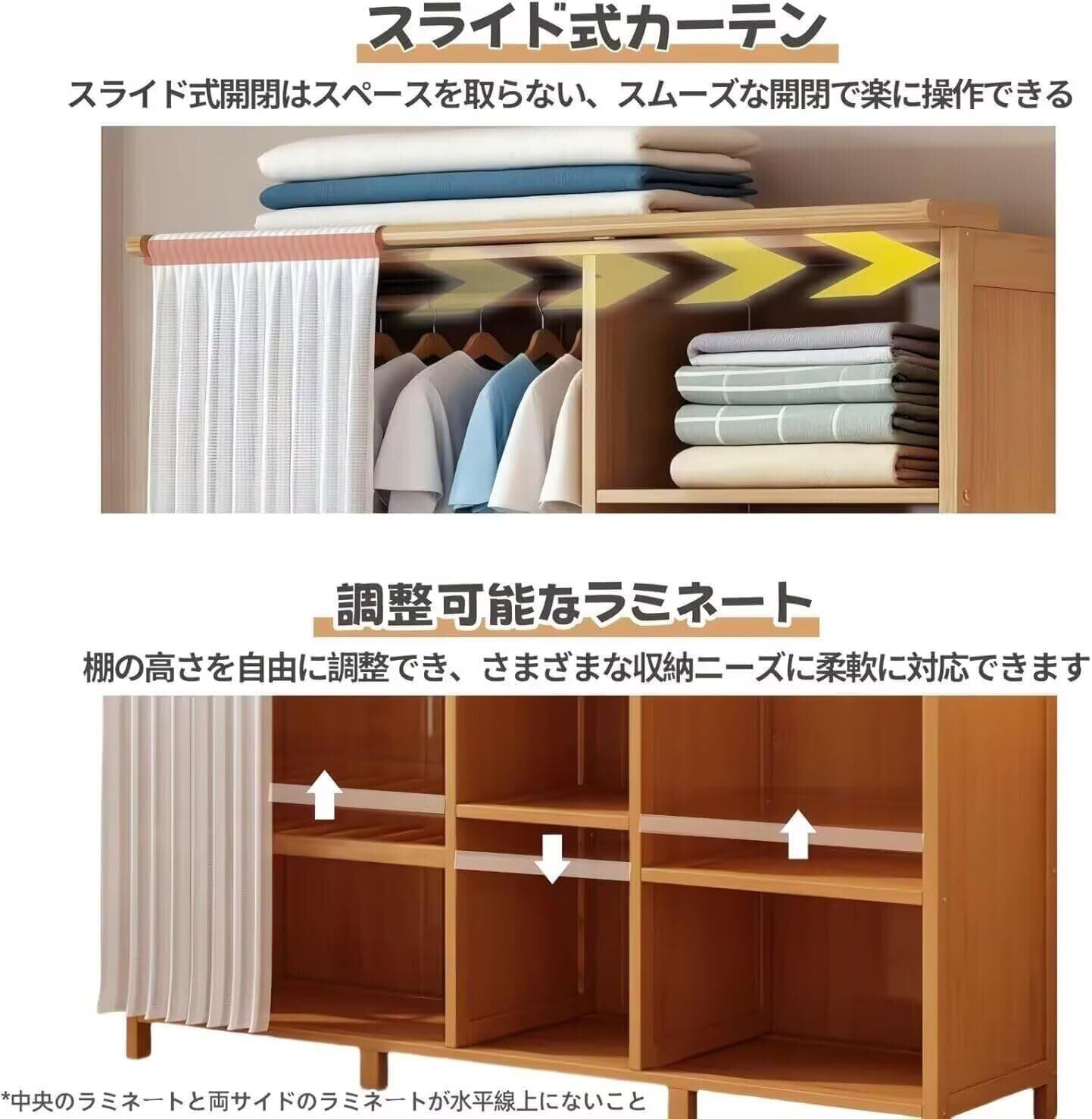 【安定性と耐久性】このワードローブは、頑丈な楠竹材質で作らており、防湿、防カビ、変形しにくく、耐久性に優れています。板材も厚く加工されているため、耐荷重性に優れています。無ホルムアルデヒド・無臭気なので、ご年配の方や小さなお子様のいるご家庭でも、安心安全にお使い頂けます。