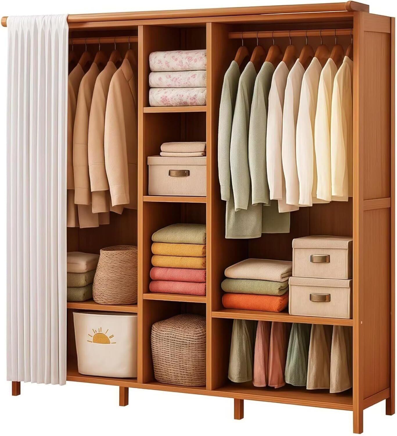【使い勝手抜群】クローゼットは防塵カーテンを装備し、ほこりを効果的に遮断し、衣類を清潔で新品の状態に保ちます。カーテンはスムーズに開閉し、操作にほとんど力は必要ありません。生地は通気性と耐摩耗性に優れ、取り外して洗濯できるため、毎日の清掃がより便利です。
